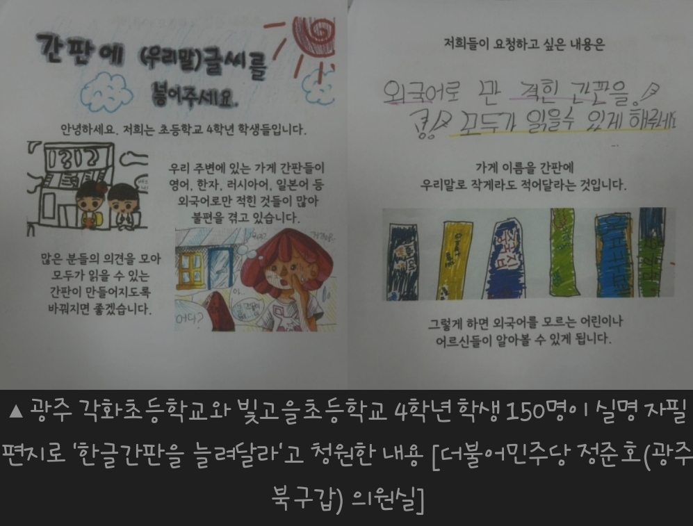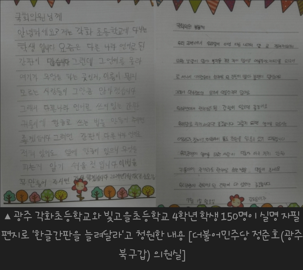 광주 각화초등학교와 빛고을초등학교 4학년 학생 150명이 실명 자필 편지로 '한글간판을 늘려달라'는 내용의 청원을 받아들였습니다.