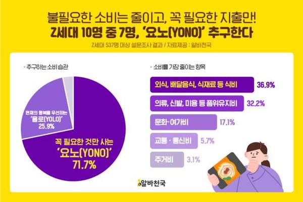 ‘저소비신조’의 등장으로 2022년부터 2030세대를 중심으로 ‘스스로의 지출을 아끼고 관리하자’는 가치관이 늘기 시작하면서 탄생한 ‘요노(YONO, You Only Need One)족’은, 욜로족과 비슷한 용어처럼 보이지만 의미는 정반대다.