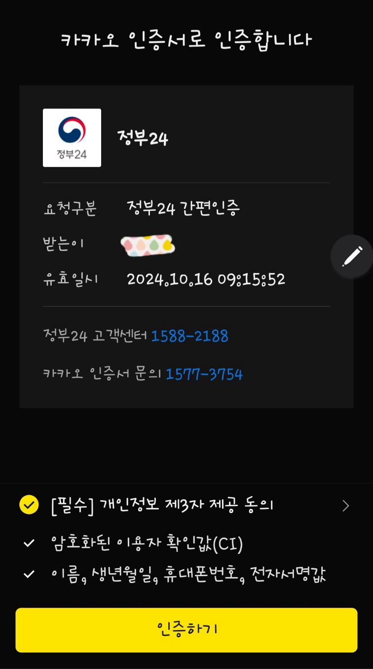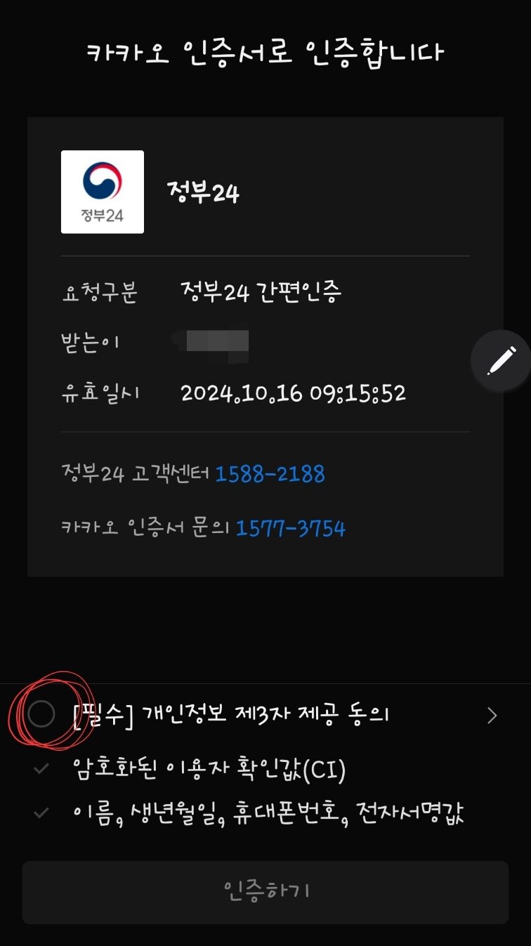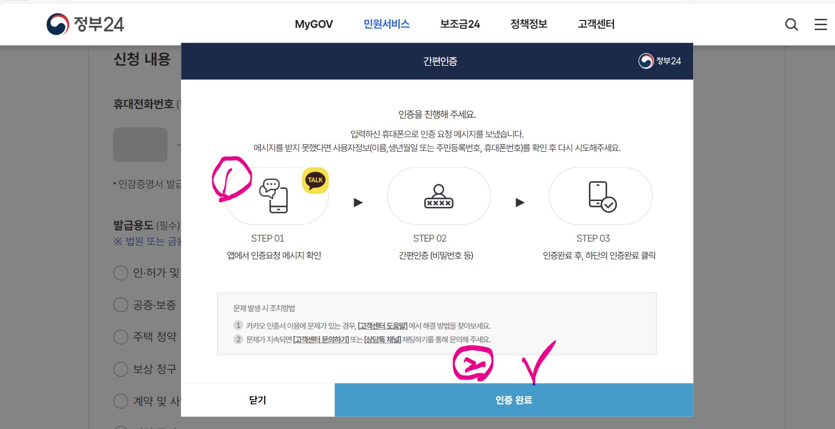 15. 카카오톡에서 확인이 끝났으면, 다시 정부24로 돌아와 <인증 완료>를 선택~