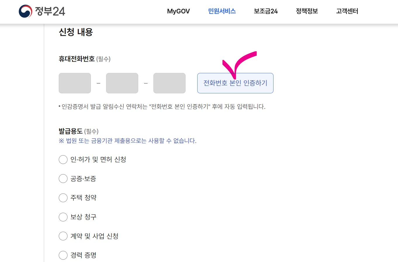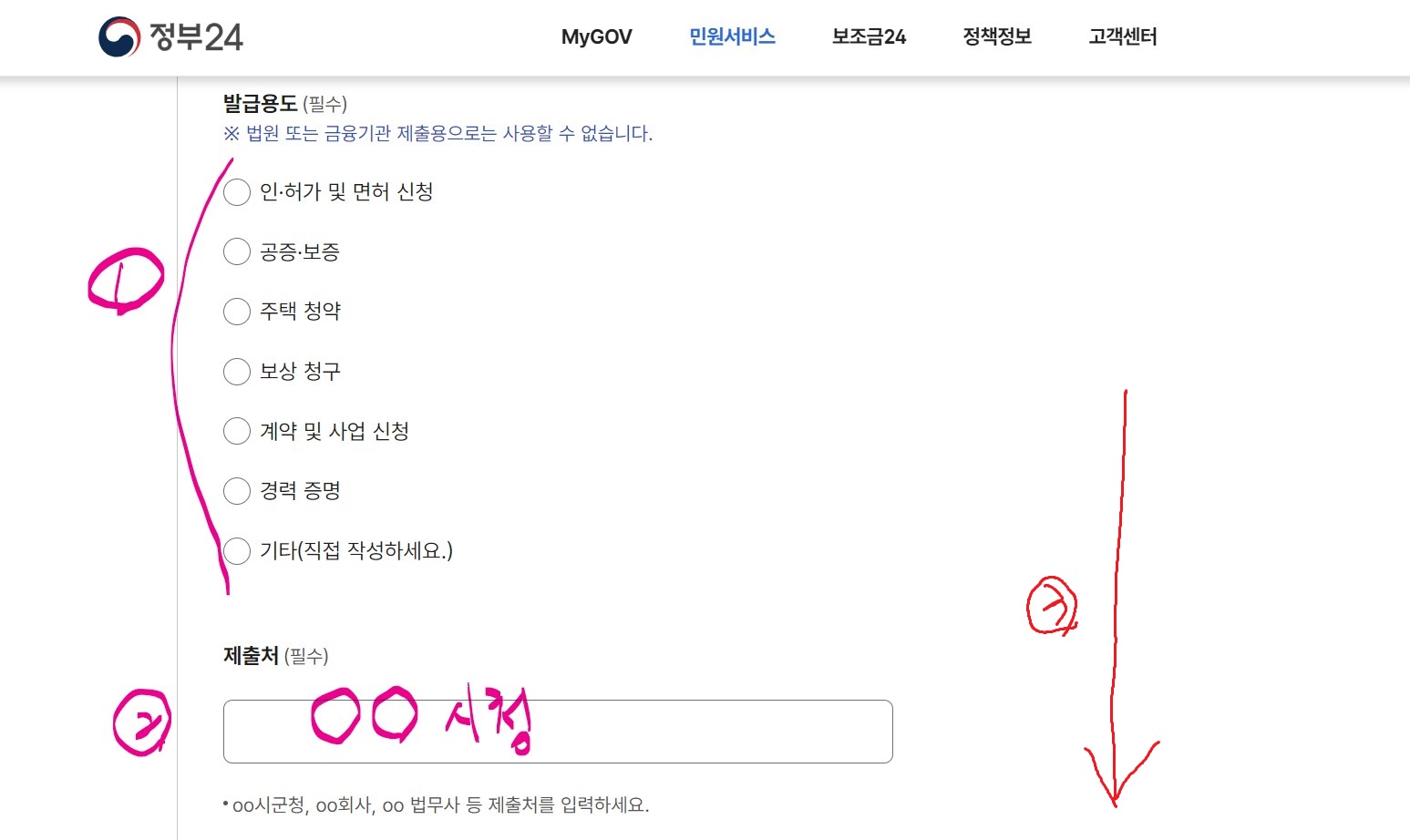 16. 인증 후 발급용도를 선택하고, 제출처를 시청, 구청 등으로 입력한 다음 아래로 내려 갑니다.