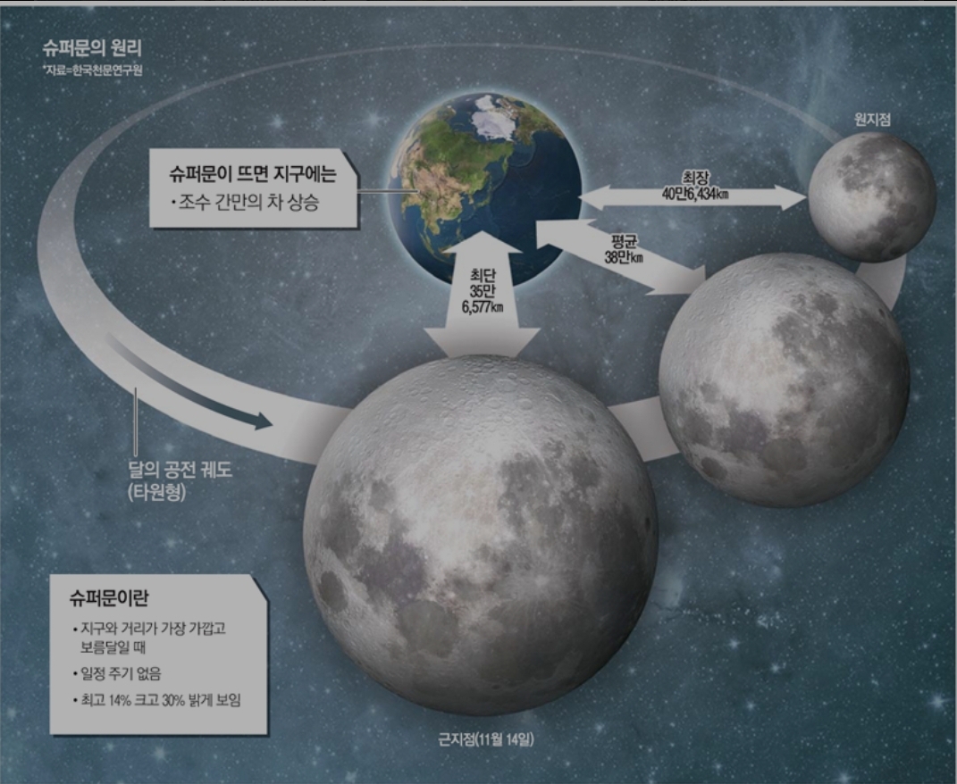 💥슈퍼문이 생겨나는 것은 지구 주위를 도는 달의 궤도가 동그란 원이 아니고 타원이기 때문이다.
