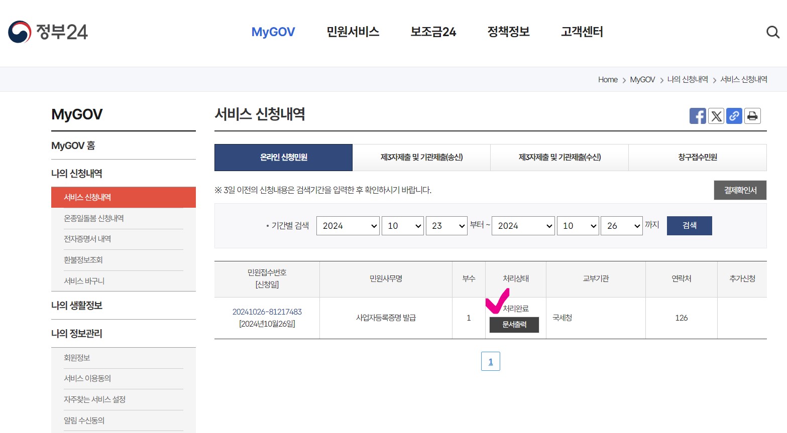 4. 발급신청이 완료되었으니 문서출력으로 마무리 하면 끝