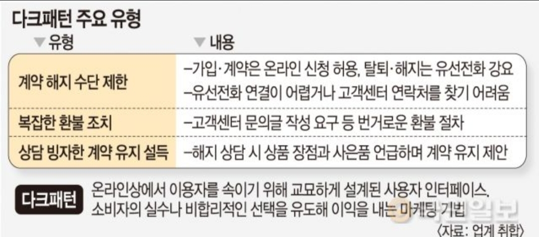📍다크패턴은 계약 해지 절차를 복잡하게 설정하거나, 해지 상담을 명목으로 계약 유지를 설득하는 등의 방식을 활용한다.