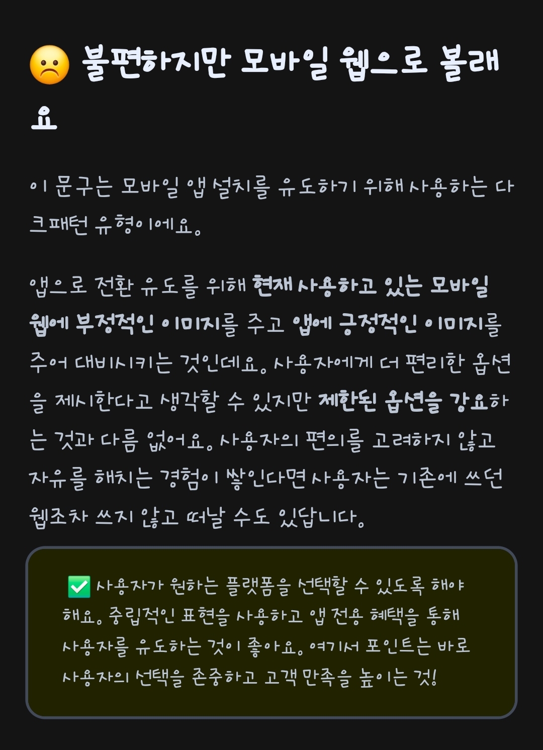 이번 혜택을 포기하시겠습니까?는 전형적인 다크패턴 유형이에요. 다크패턴은 사용자를 위협하며 공급자가 원하는 행동을 하도록 유도하는 방식인데요. 이를 막기 위한 지침도 공개되어 있으