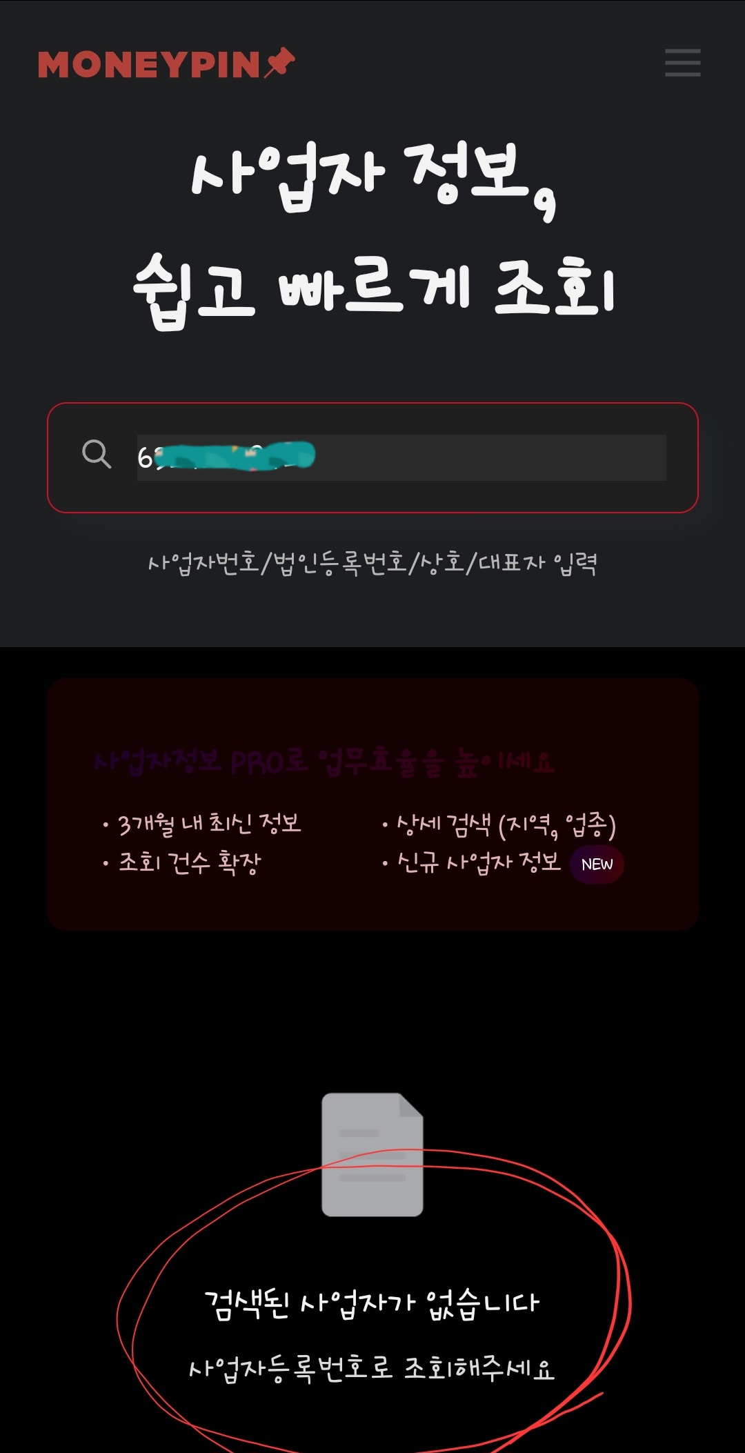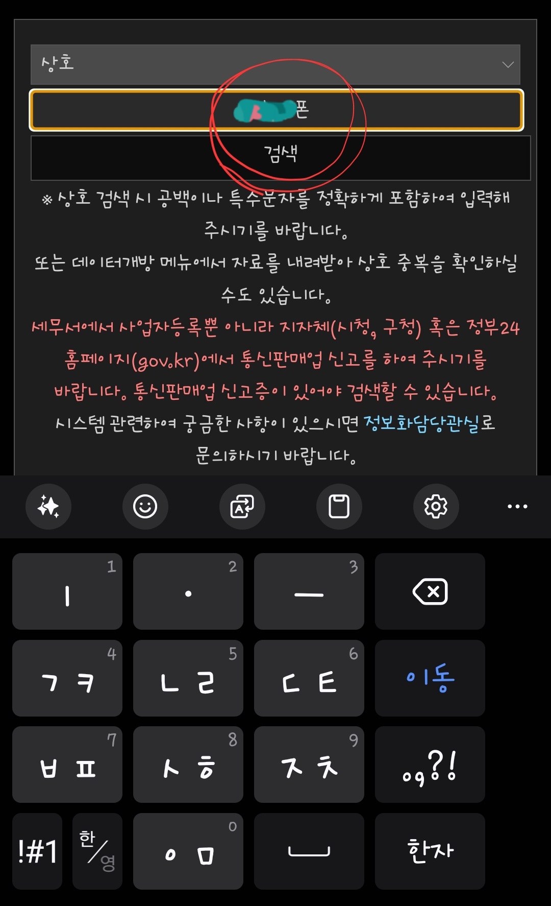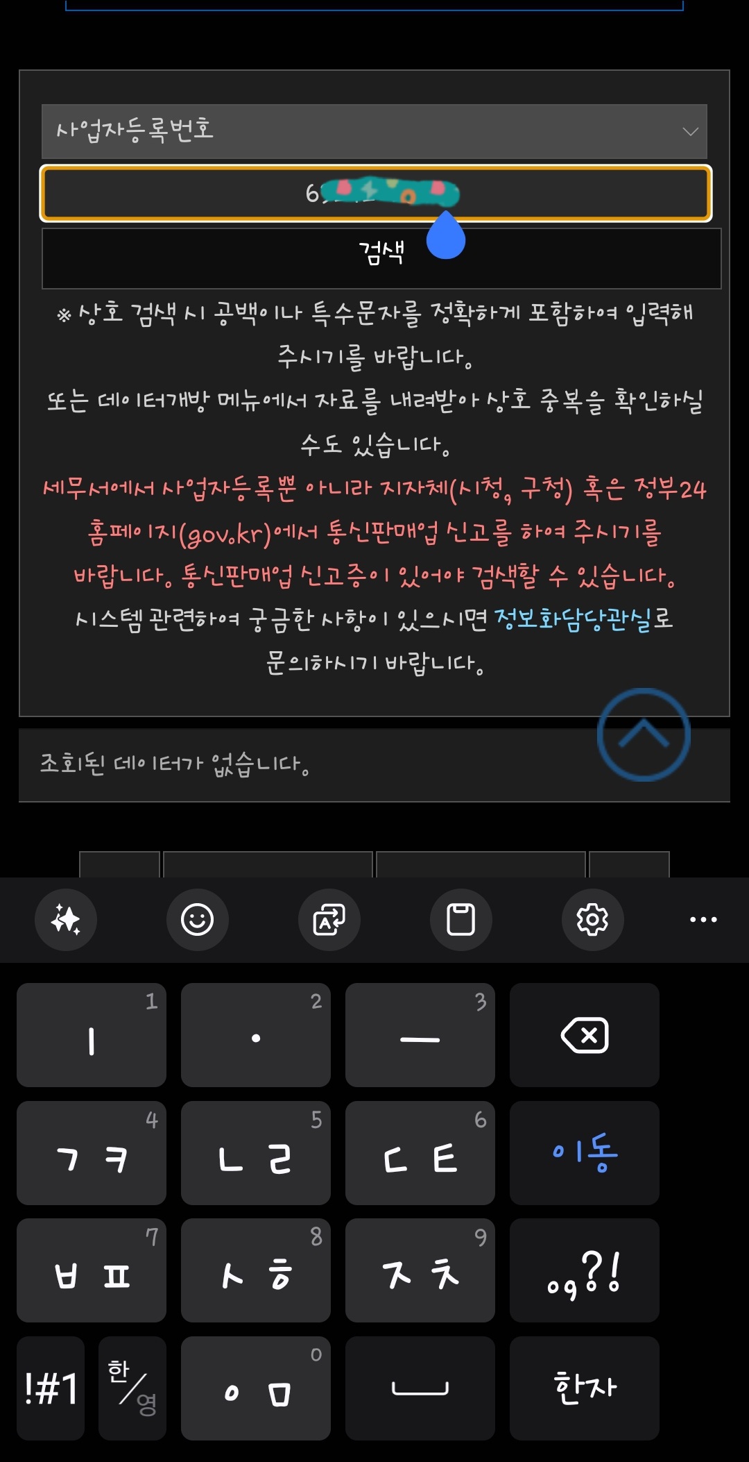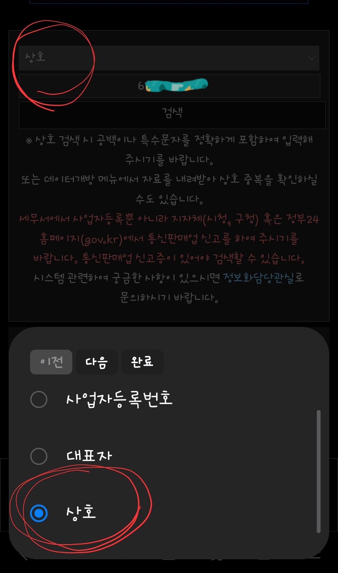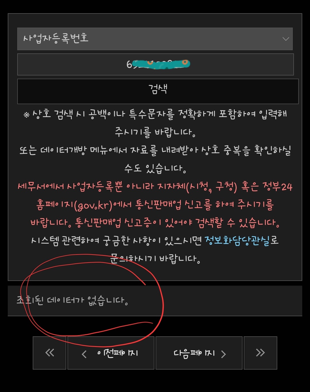 6. 이번에도 사업자등록번호 조회에 나타나지 않습니다. 그래서 상호명으로 검색을 실시해 보겠습니다.