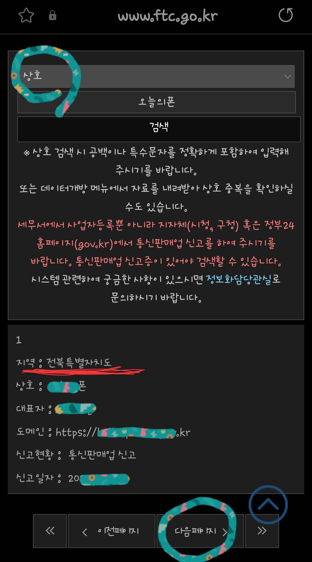 7. 광고 업체의 이름을 입력하고 검색을 했더니 한곳이 나왔습니다. 다음페이지를 눌러서 여러가지가 있는지 확인해 봤는데 단 한곳이 전북에 있다고 나타납니다. 하지만 해당업체가 제시한 정보에는 서울이라고 주소가 나와있기에 동일한 업체가 아님을 알 수 있습니다.