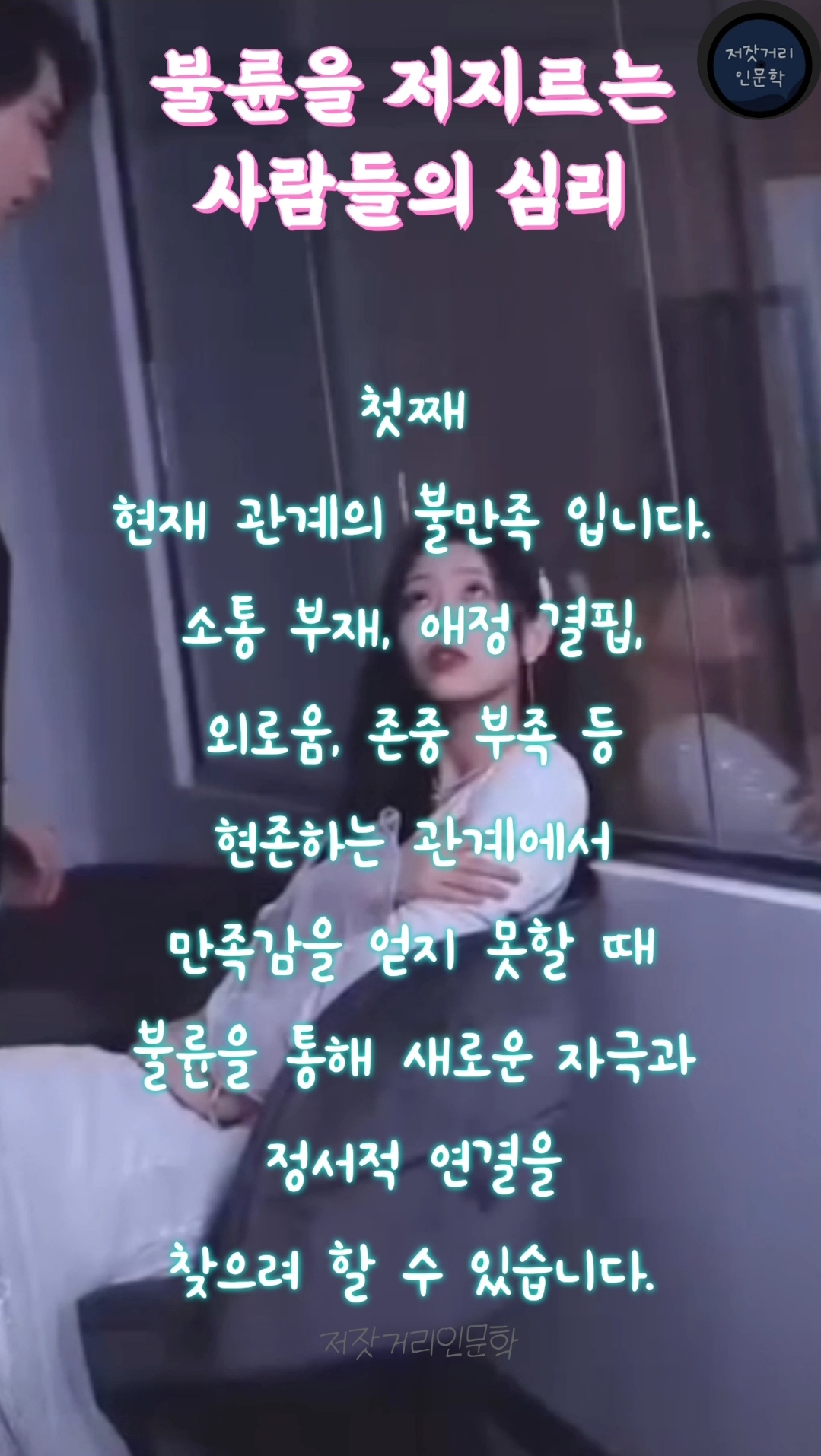 소통 부재, 애정 결핍, 외로움, 존중 부족 등 현존하는 관계에서 만족감을 얻지 못할 때 불륜을 통해 새로운 자극과 정서적 연결을 찾으려 할 수 있습니다.