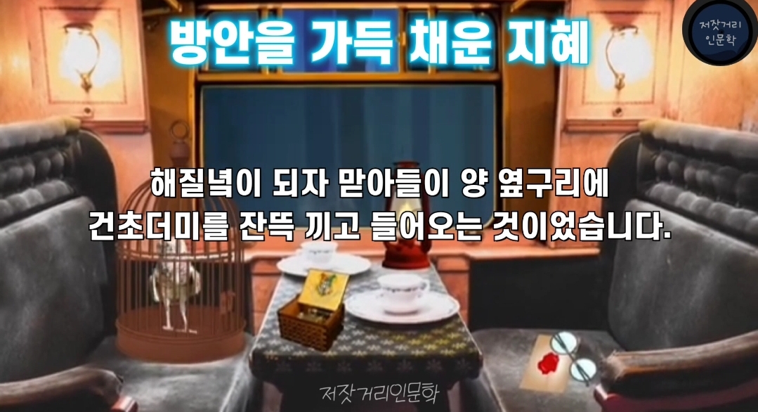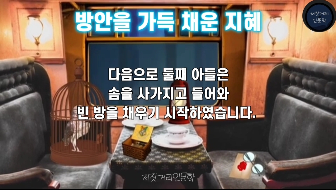 다음으로 둘째 아들은 솜을 사가지고 들어와 빈 방을 채우기 시작하였습니다.