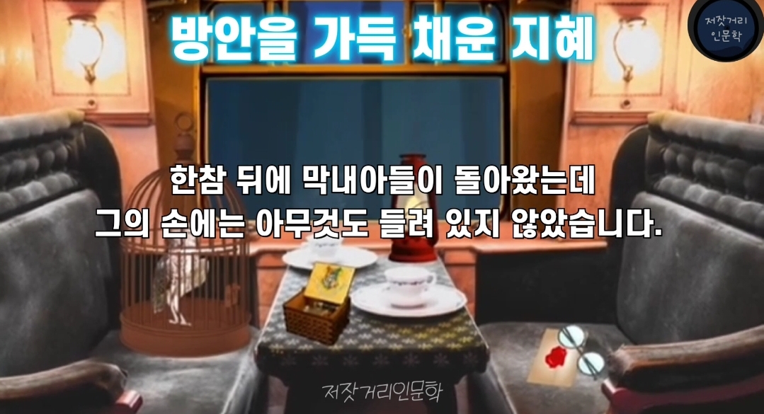 한참 뒤에 막내아들이 돌아왔는데 그의 손에는 아무것도 들려 있지 않았습니다.