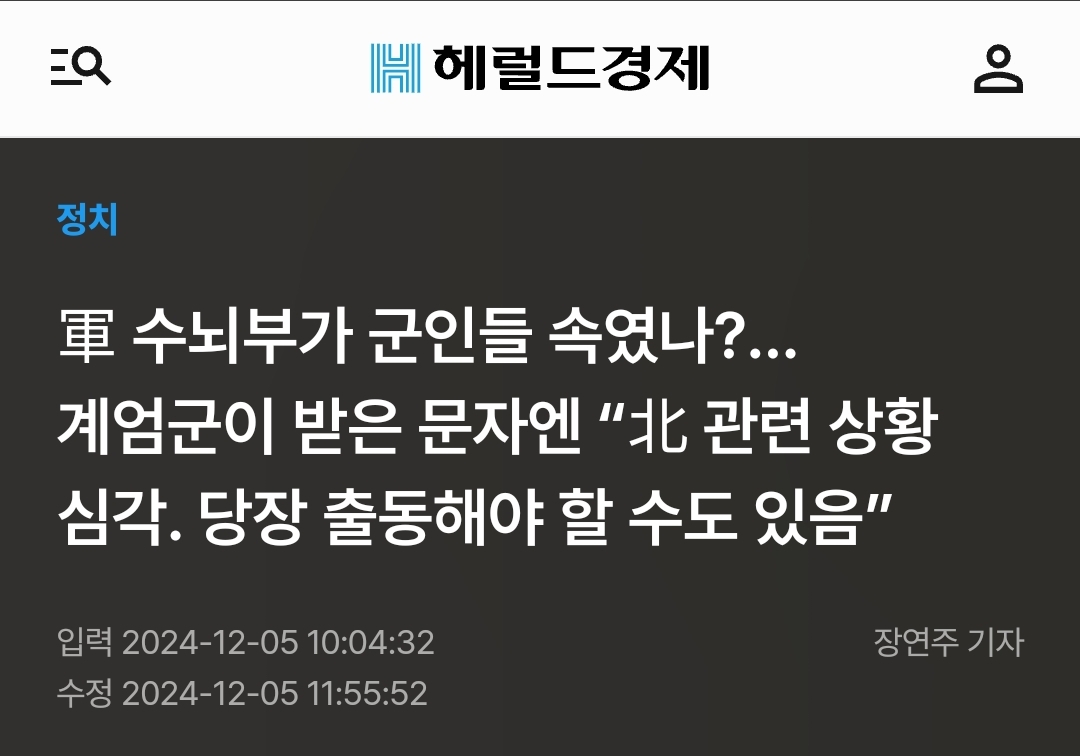 軍 수뇌부가 군인들 속였나?…계엄군이 받은 문자엔 “北 관련 상황 심각. 당장 출동해야 할 수도 있음” 2024.12.05