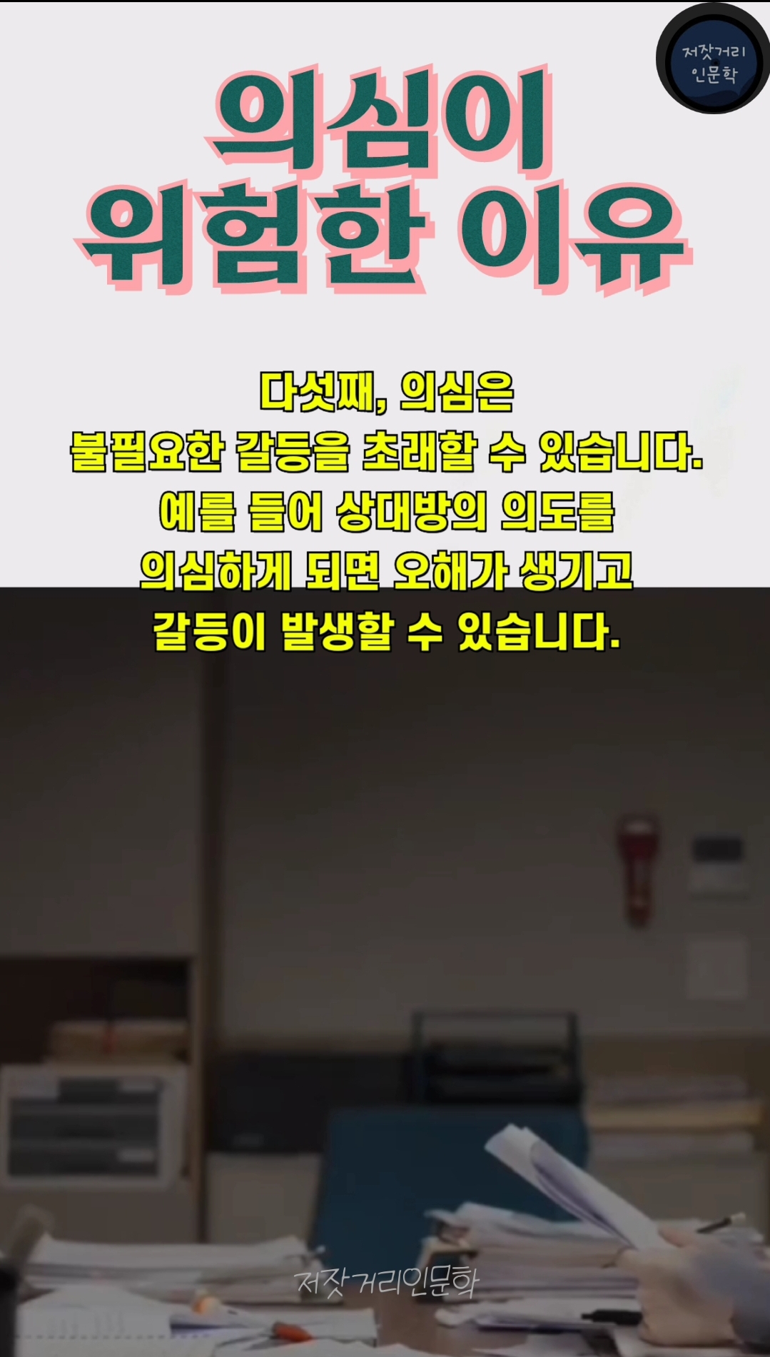 5. 갈등 유발 : 의심은 불필요한 갈등을 초래할 수 있습니다. 예를 들어, 상대방의 의도를 의심하게 되면 오해가 생기고, 갈등이 발생할 수 있습니다.