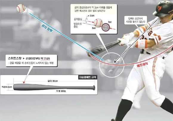 이승엽이 쓰는 배트의 길이는 85㎝다. 배트의 스위트 스팟은 손잡이 부분으로부터 약 71㎝ 떨어진 위치에 존재한다. 이승엽은 몸쪽 공이든 바깥쪽 공이든 스위트 스팟에 맞히는 능력이 뛰어나다. 그야말로 ‘스위트 스윙’이다.