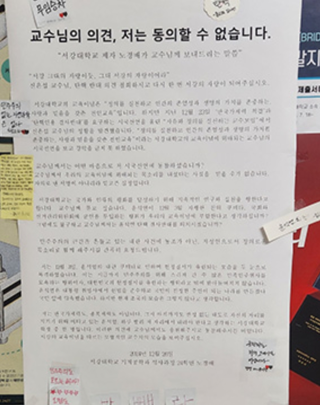 서강대 석사 과정생으로 본인을 소개한 필자는 대자보에서 “정의를 실천하고 인간 존엄성과 생명 가치를 존중하는, 사랑과 믿음을 갖춘 전인교육이라는 서강대의 교육이념에 위배되는 교수님의 시국선언을 보고 경악을 금치 못했다”고 썼습니다.
