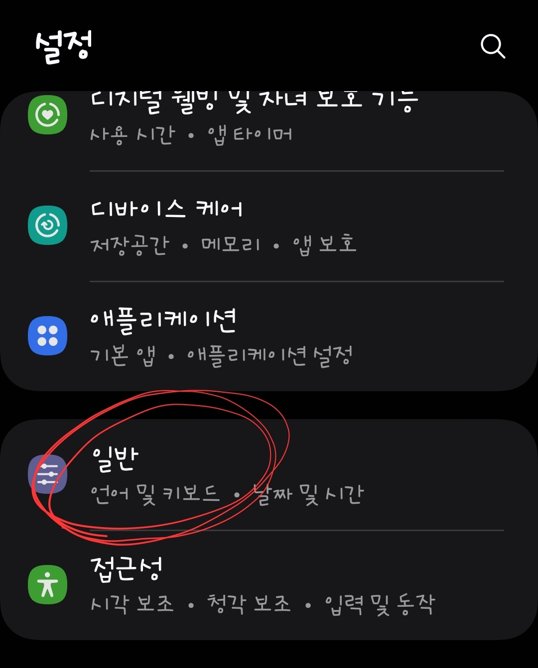 스마트폰 자판을 무르면 위쪽으로 글자가 막 나오는데요, 이게 거슬릴 때가 있습니다🤬일명 《자동완성》이라는 기능인데요.이걸 끄는 방법을 알아 보겠습니다.1. 설정열기2. 일반 선택3. 삼성