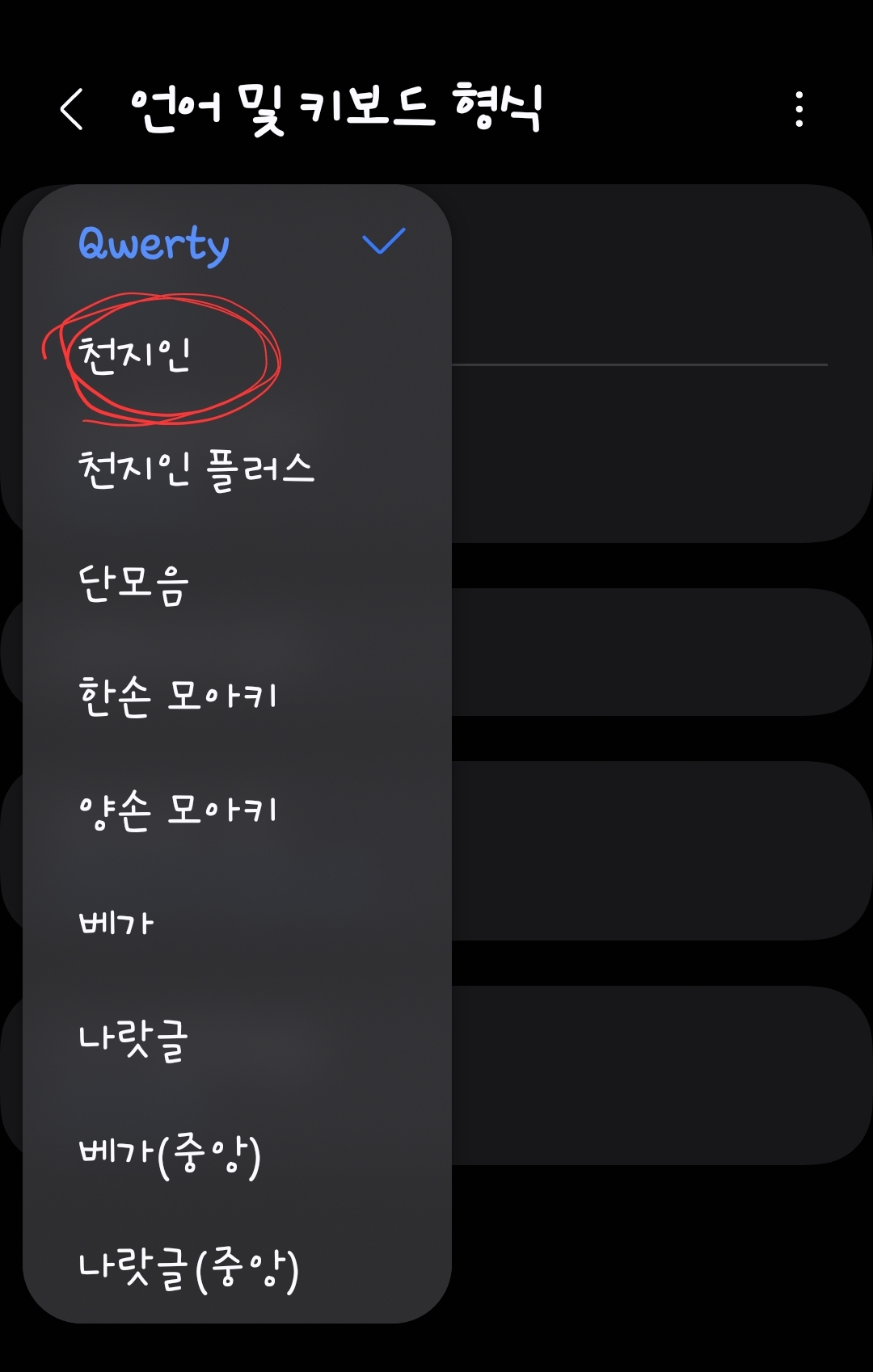 📌 이렇게 넓은 모드(천지인 키보드 설정)로 말입니다👌