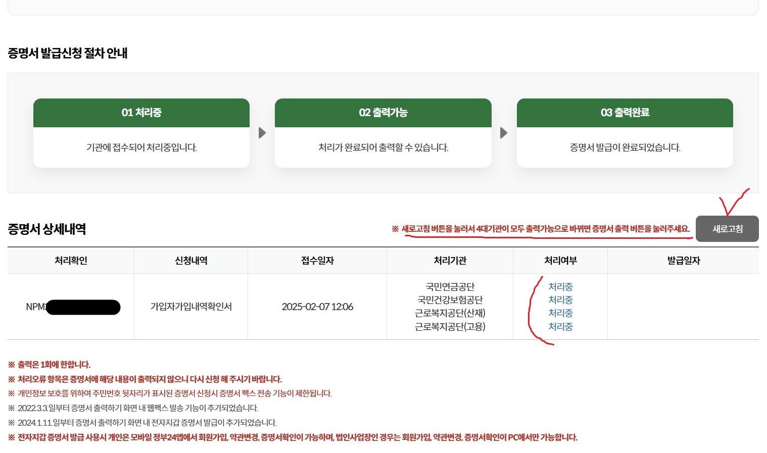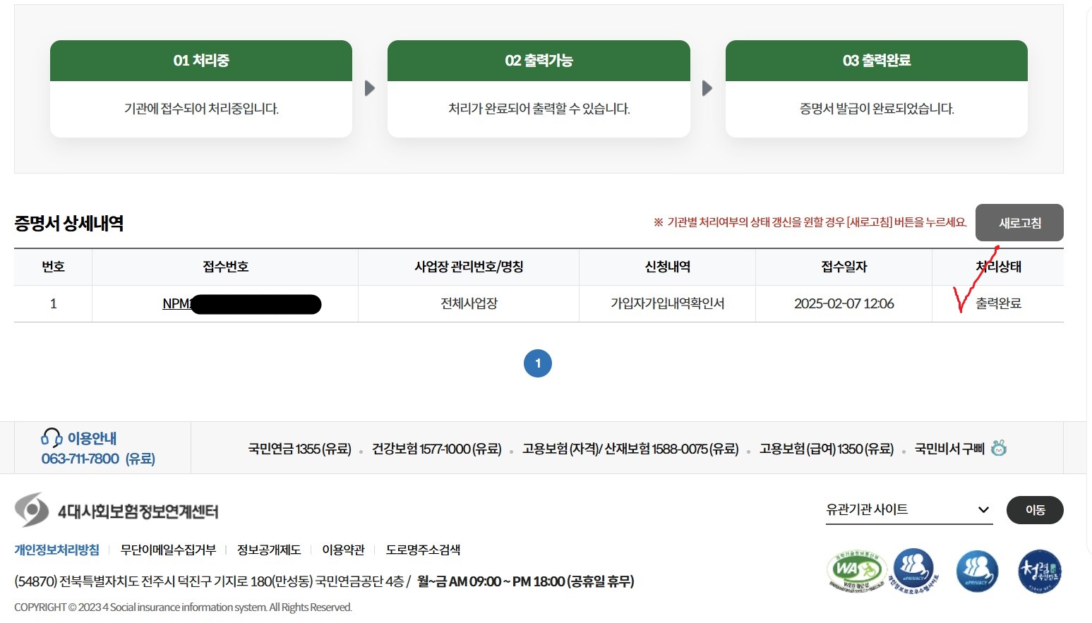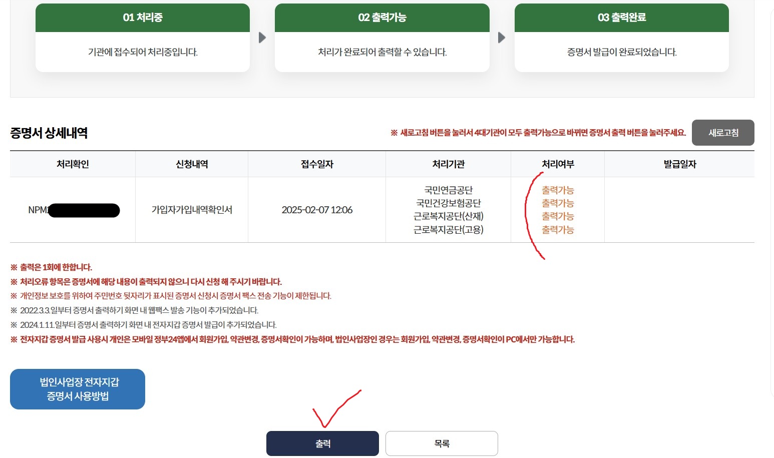 7. 출력완료가 나오면 미가입으로 나왔는지 확인합니다