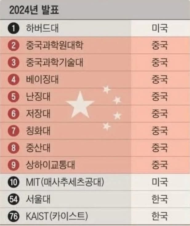 2016 네이처 인덱스에는 중국 대학이 1개뿐이었는데 2024 인덱스에는 8개나 포함되어 우리에게는 '웨이크업 콜'이다.