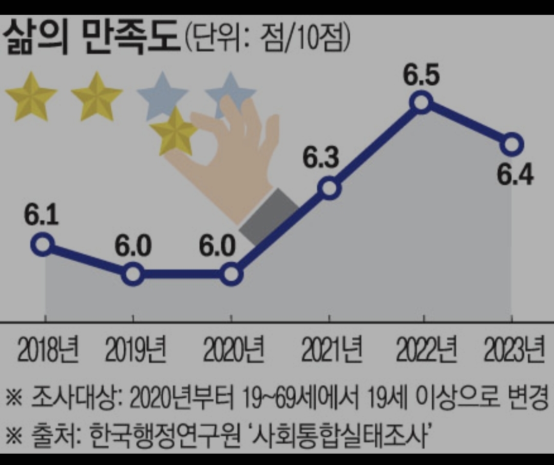 통계청은 24일 이런 내용이 담긴 ‘국민 삶의 질 2024’ 보고서를 발간했다. 한국인 삶의 만족도는 2023년 기준 6.4점으로 전년보다 0.1점 낮아졌다. 삶의 만족도는 객관적 삶의 조건에 대한 주관적인 만족 정도를 보여주는 지표로 0∼10점으로 측정한다.