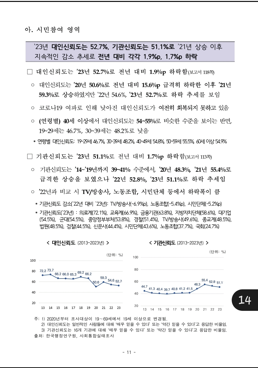 한국인의 전반적인 삶의 만족도가 소폭 악화했다. 경제협력개발기구(OECD) 회원국 중에서 여전히 하위권에 머물고 있었다. 소득 수준에 따라 삶의 만족도가 비례하는 경향은 여전했고, 나이가 많을수록 삶의 만족도는 하락하는 경향을 보였다.