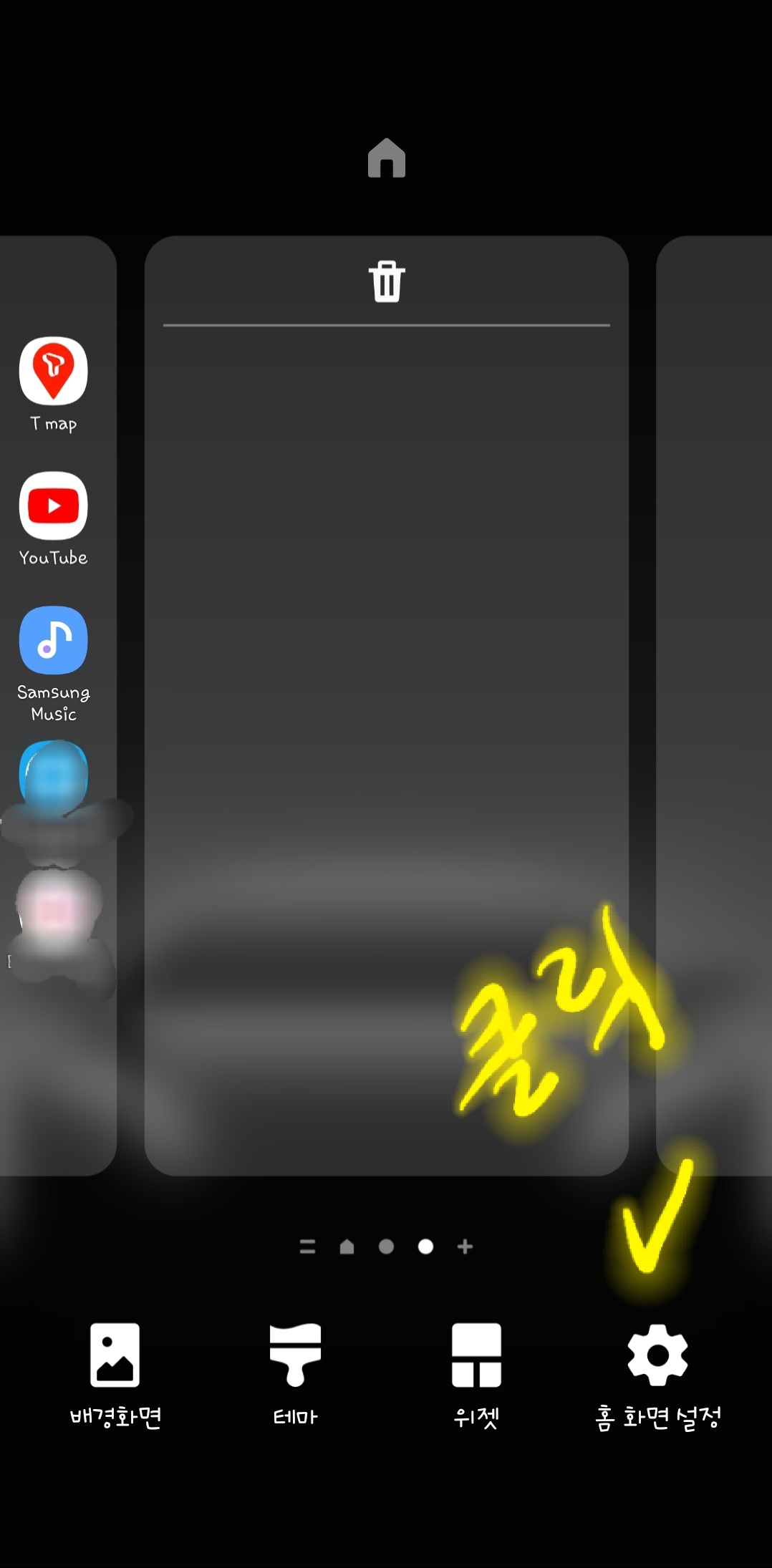 4. 새로 나온 화면 아래쪽 보이는 아이콘 중 오른쪽 끝에 있는 《홈화면 설정》을 눌러 줍니다.