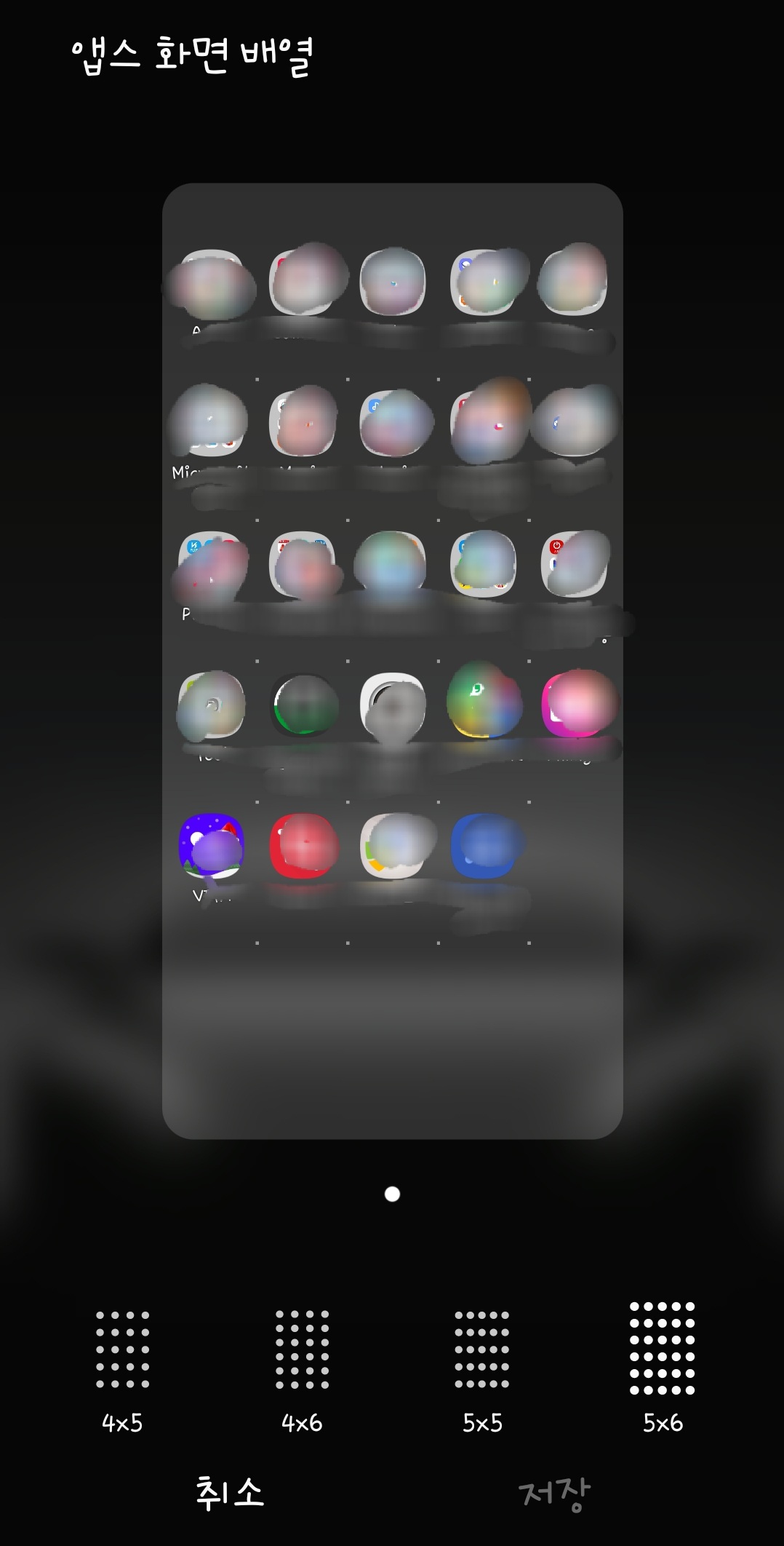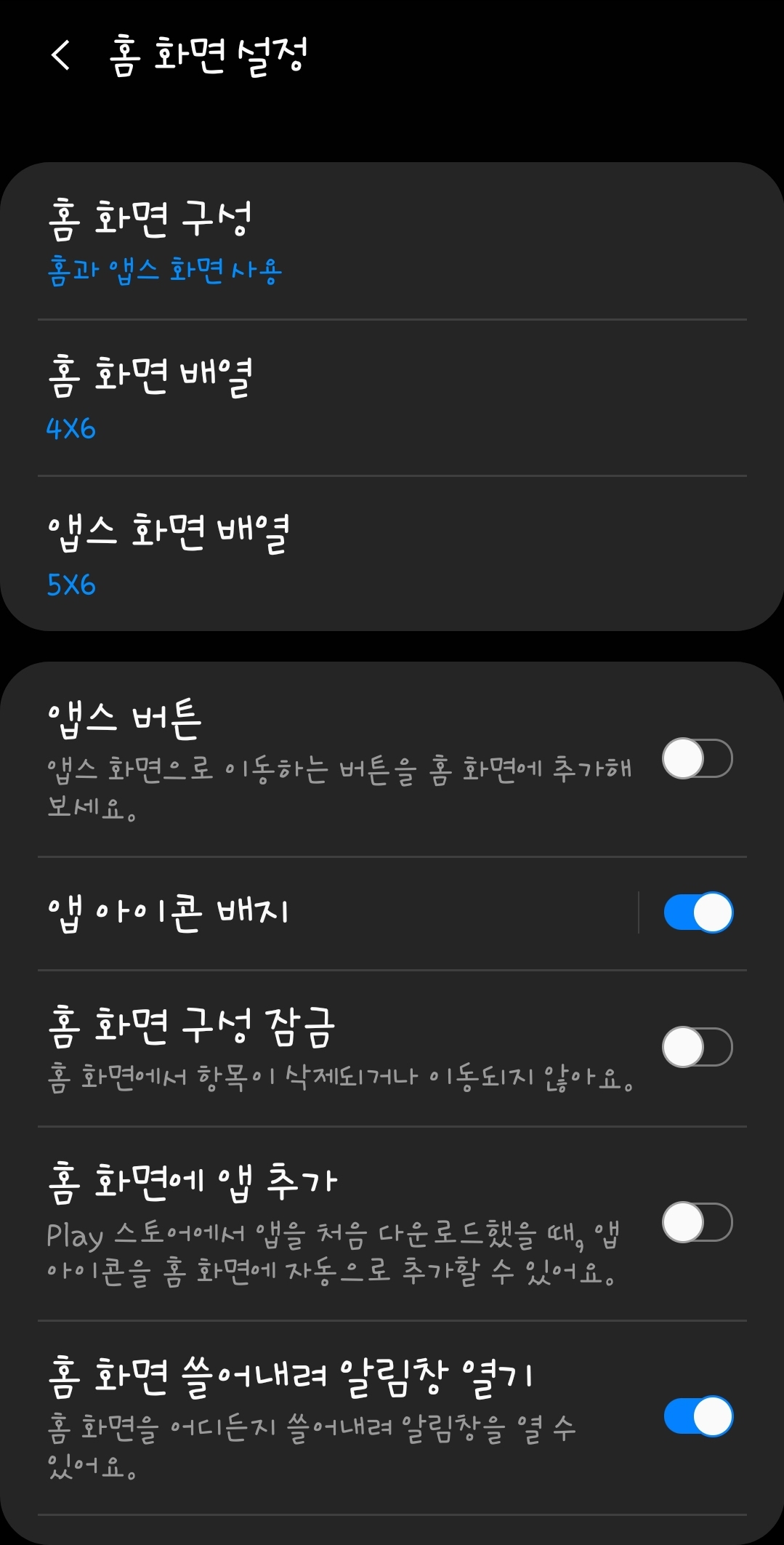 6. 여기서 《앱스 화면 배열》을 눌러 줍니다. 바로 위에 있는 《홈화면 배열》도 이렇게 조정하면 되겠죠‼️
