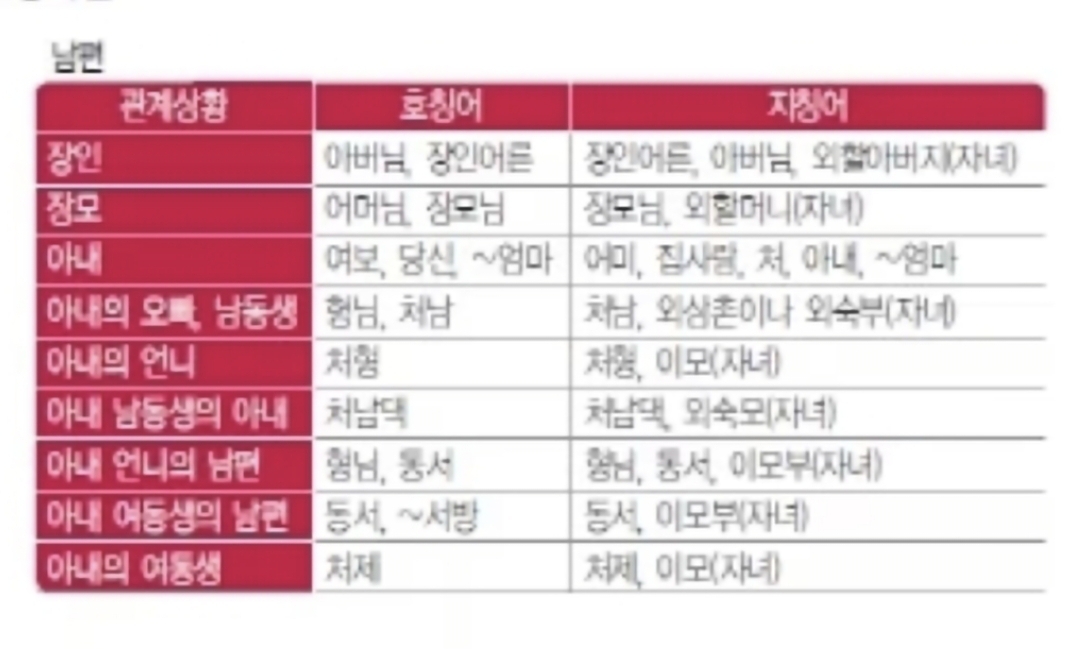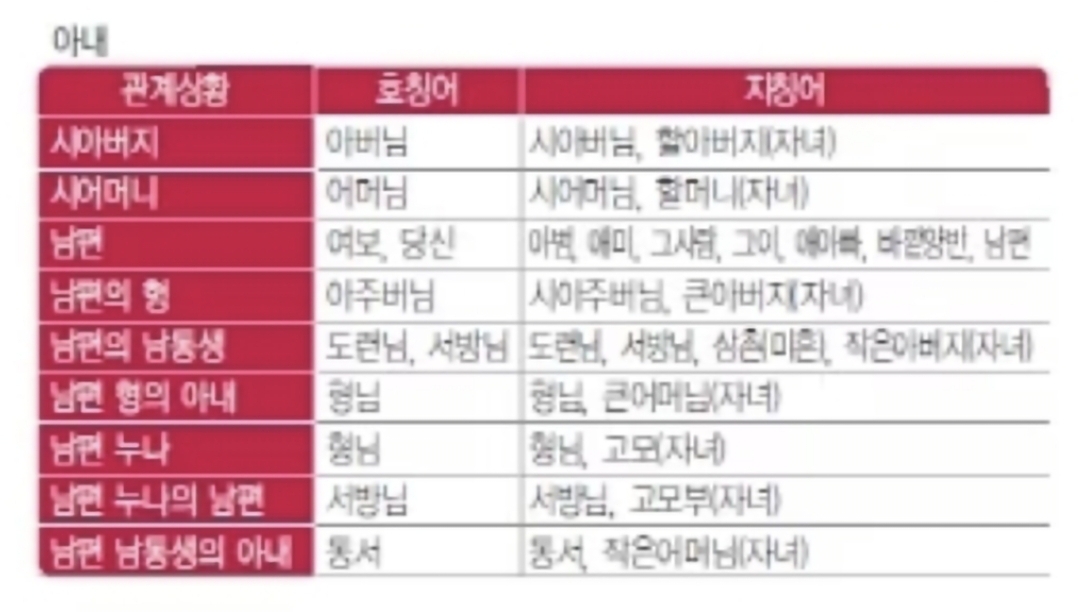 🩸배우자 가족에 대한 호칭은 배우자를 기준으로 따진다. 배우자보다 항렬이 높은 가족은 나이와 상관없이 존대하는 것이 전통이다.
