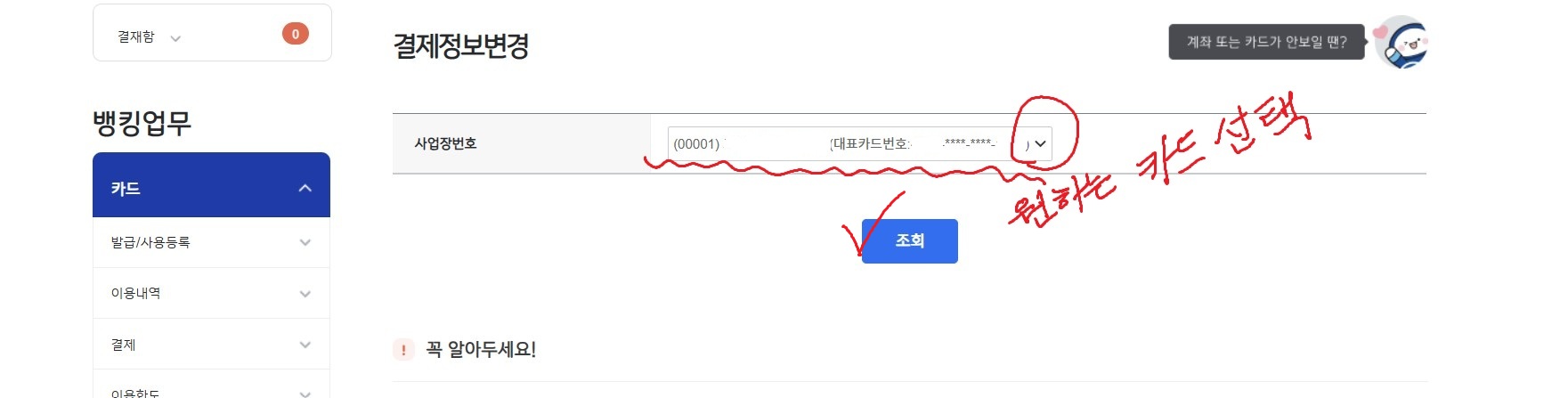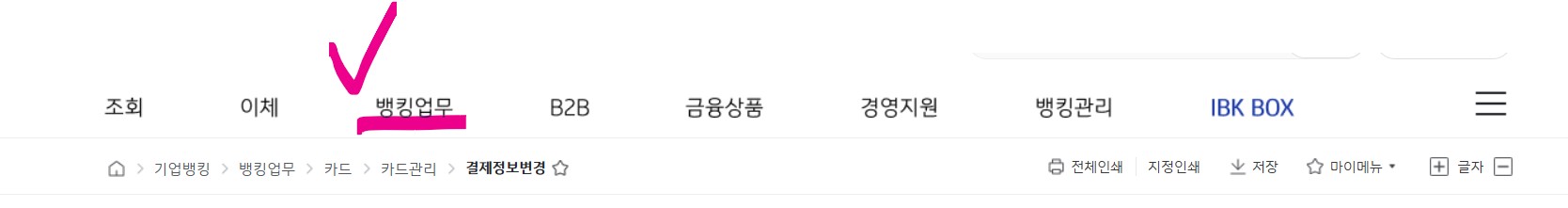 컴퓨터나 노트북에서 변경하려니, 기업은행이 다른 카드에 비해 살짝 어렵더라구요.