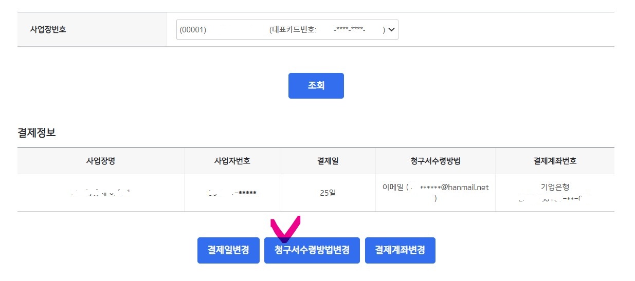 7. 선택된 카드 화면에서 아래에 보이는 《청구서수령방법변경》 클릭.