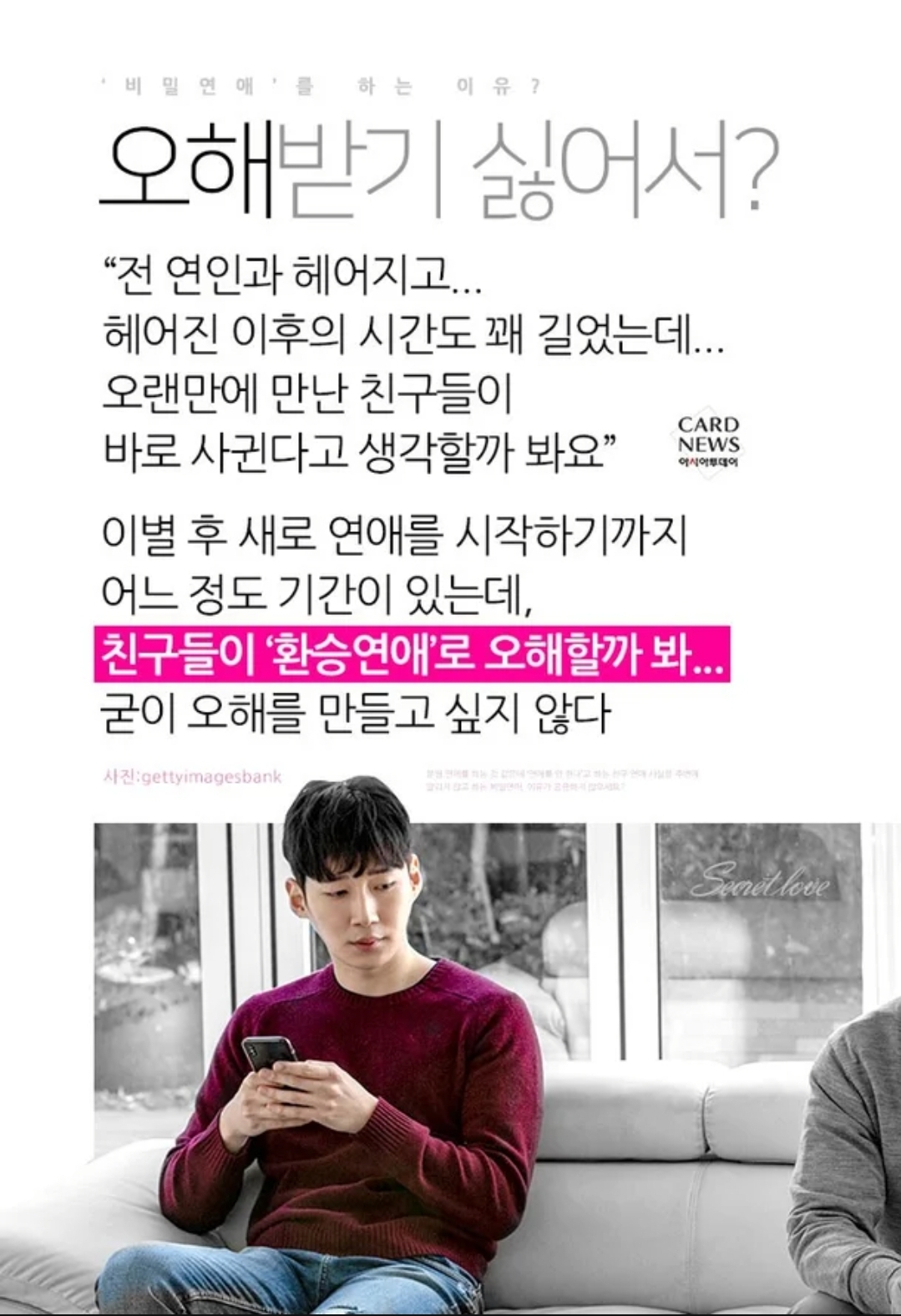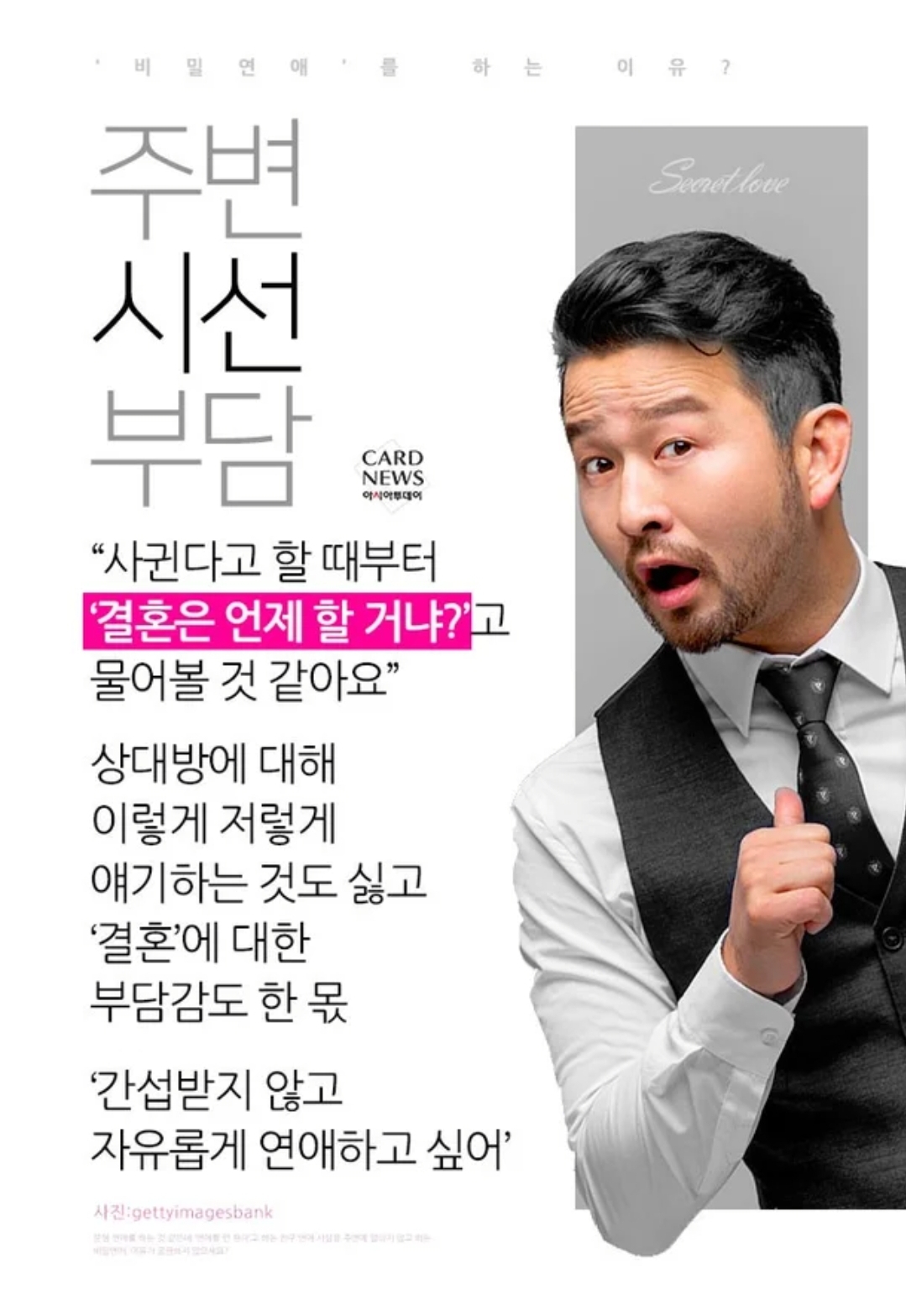 한눈에 보는 오늘 : 연예가 화제 - 뉴스 : 아시아투데이 백수원 기자 = [카드뉴스] 비밀에는 이유가 있다... 우리가 ‘비밀연애’를 하는 이유? 분명 연애를 하는 것 같은데 ‘연애를 안 한다’고