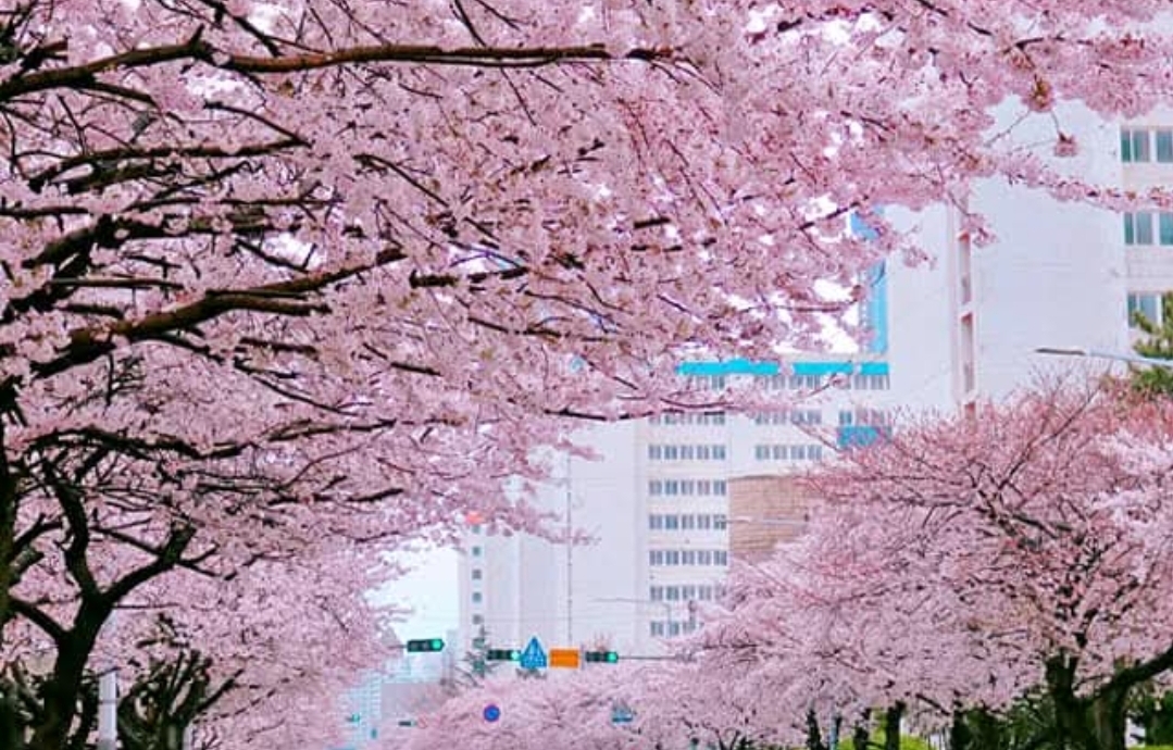 * 해안가를 따라 벚꽃이 만개하여 아름다운 풍경을 연출합니다.