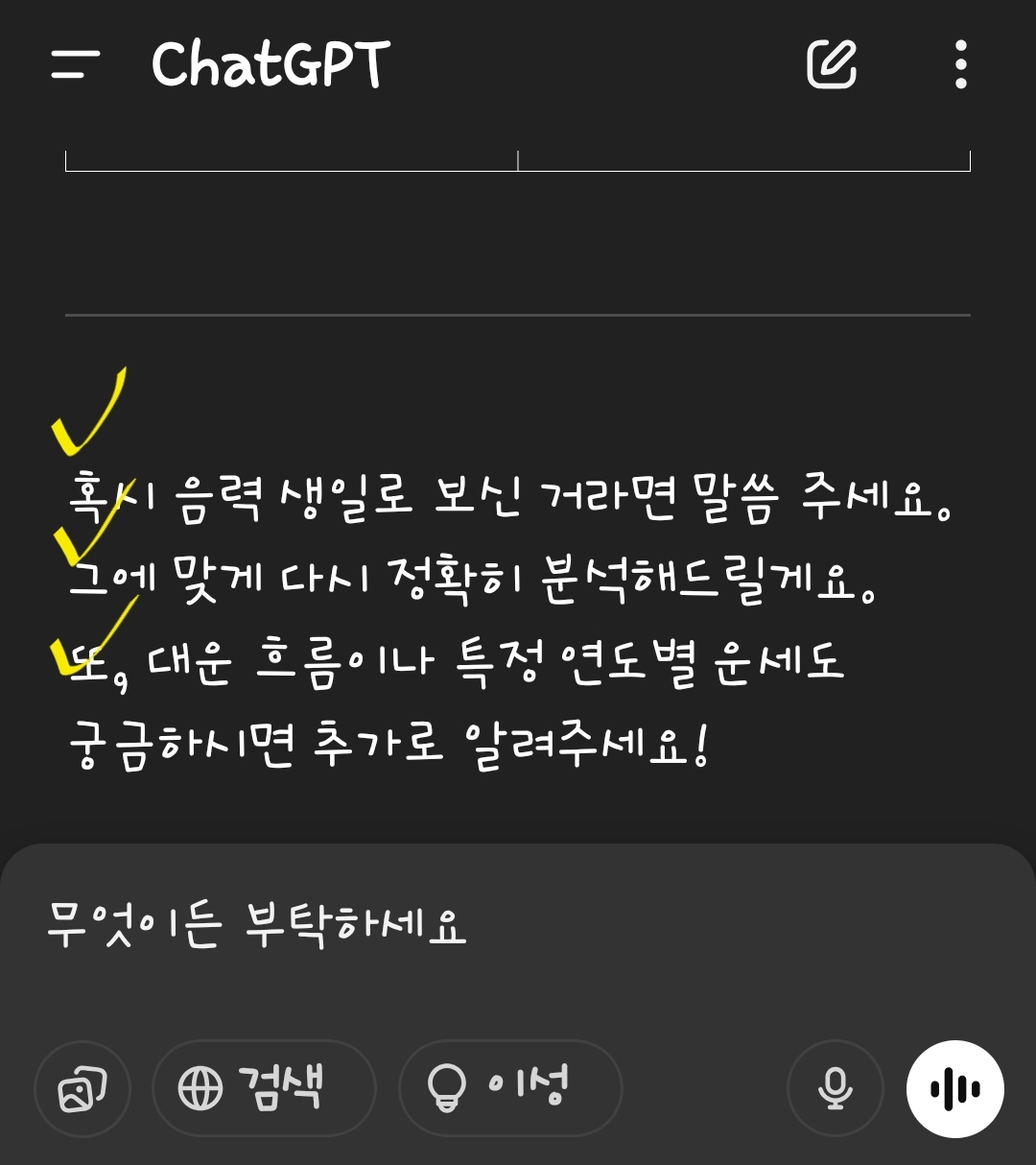 😎 챗gpt로 사주 보는 방법은 재미로 보는 것이니, 이를 맹신해서 일희일비(一喜一悲) 하지 마시길...