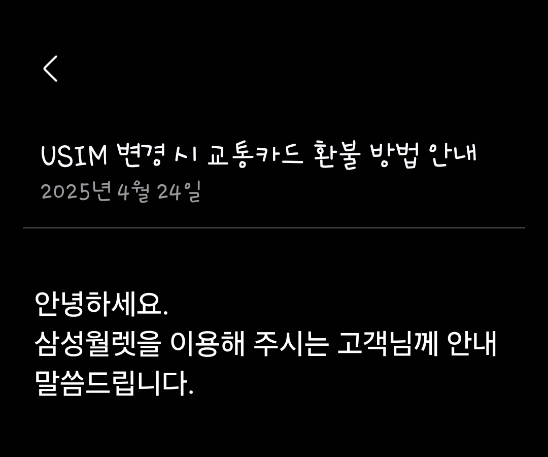 - 기존 USIM을 장착하여 이용하던 교통카드사의 교통카드를 재발급 받은 뒤, 환불 절차 진행