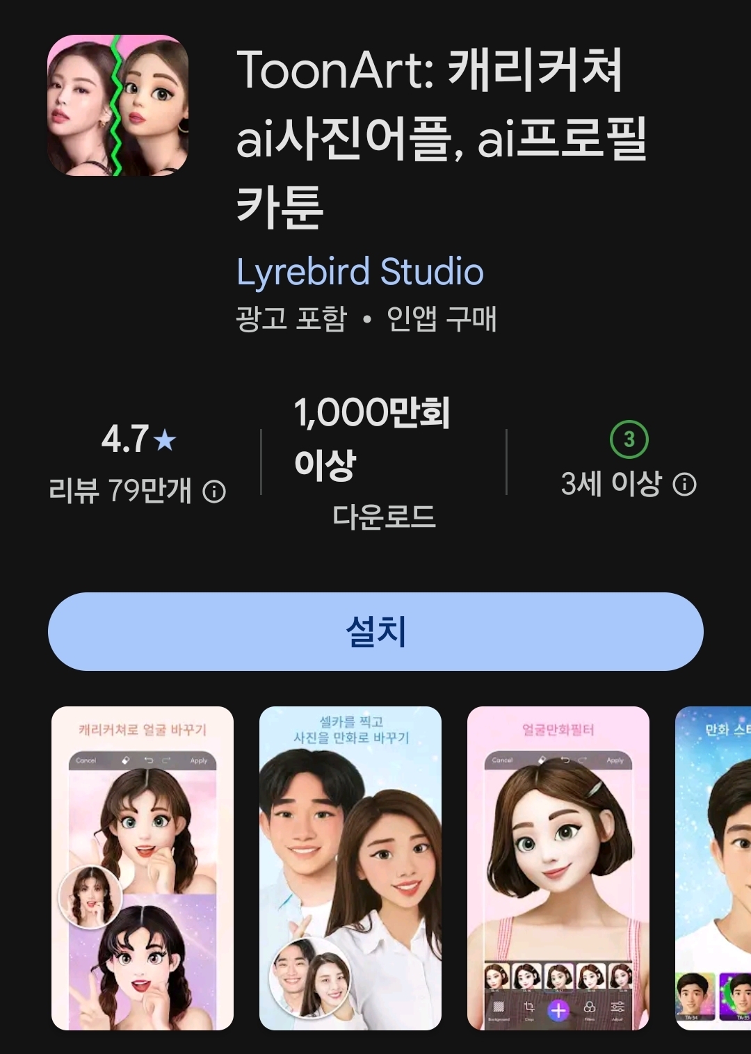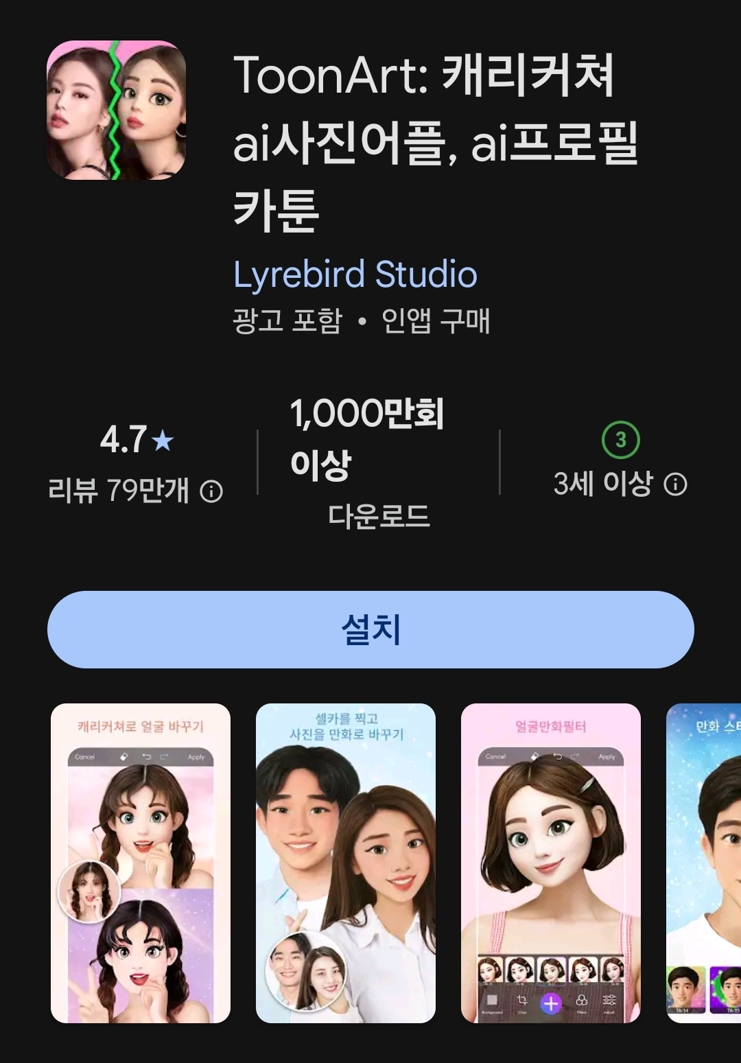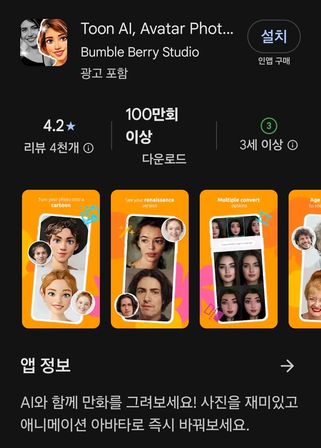 ToonTap : 사진을 멋진 3D 만화 캐릭터나 캐리커처 스타일로 변환해 줍니다. 탭 한 번으로 간편하게 만화 효과를 적용할 수 있으며, 프로 구독 시 더 많은 기능을 이용할 수 있습니다. (iOS 및 Android 지원)