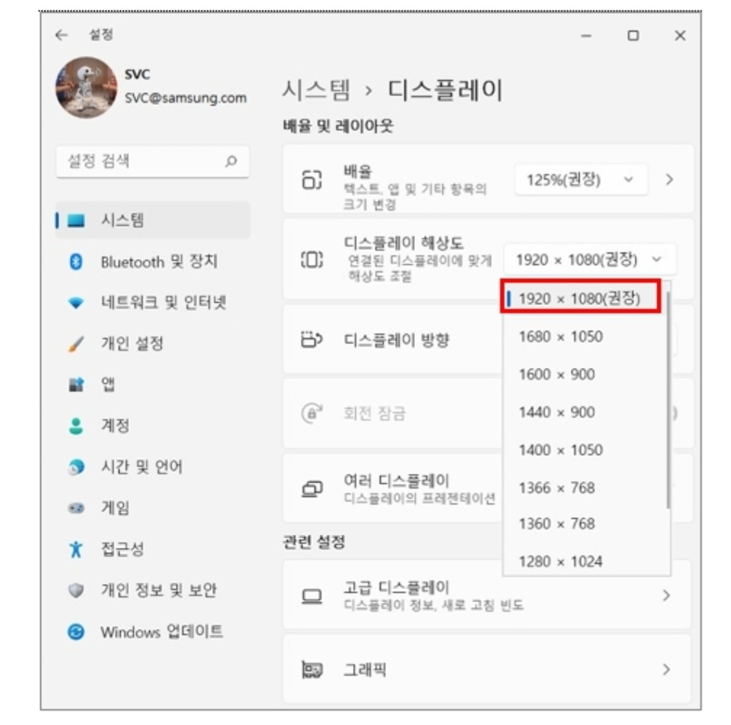 2) 해상도를 클릭하여 모니터에서 지원하는 최적의 해상도(1920x1080 권장)로 조정하세요.
