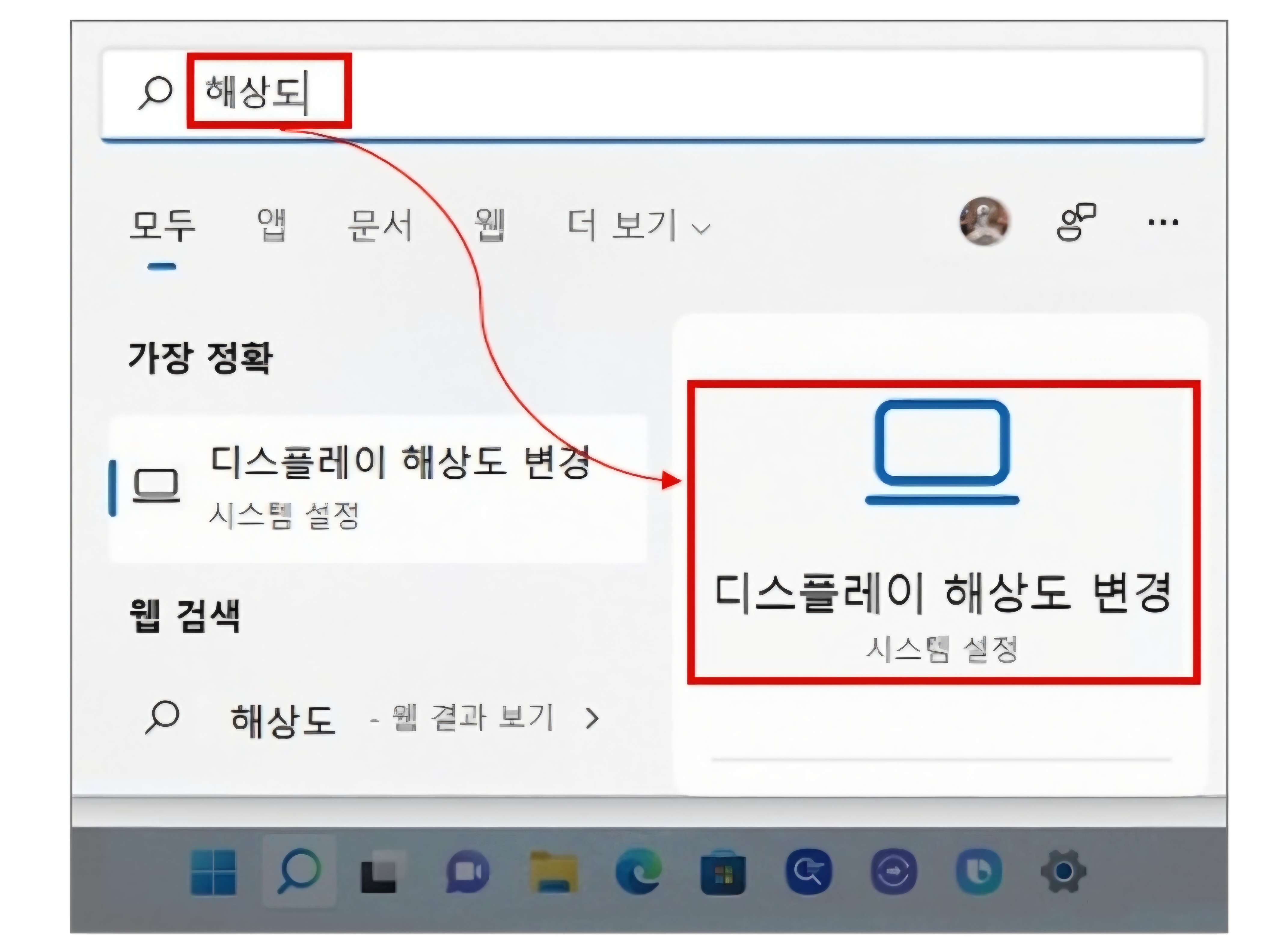 1) 키보드에서 Windows 로고 키 + Q 키 를 누른 후 “해상도” 입력 → 디스플레이 해상도 변경 클릭하세요.