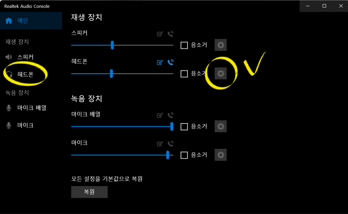 4. 《헤드폰》으로 가서 오른쪽 끝에 있는 《설정》을 선택합니다