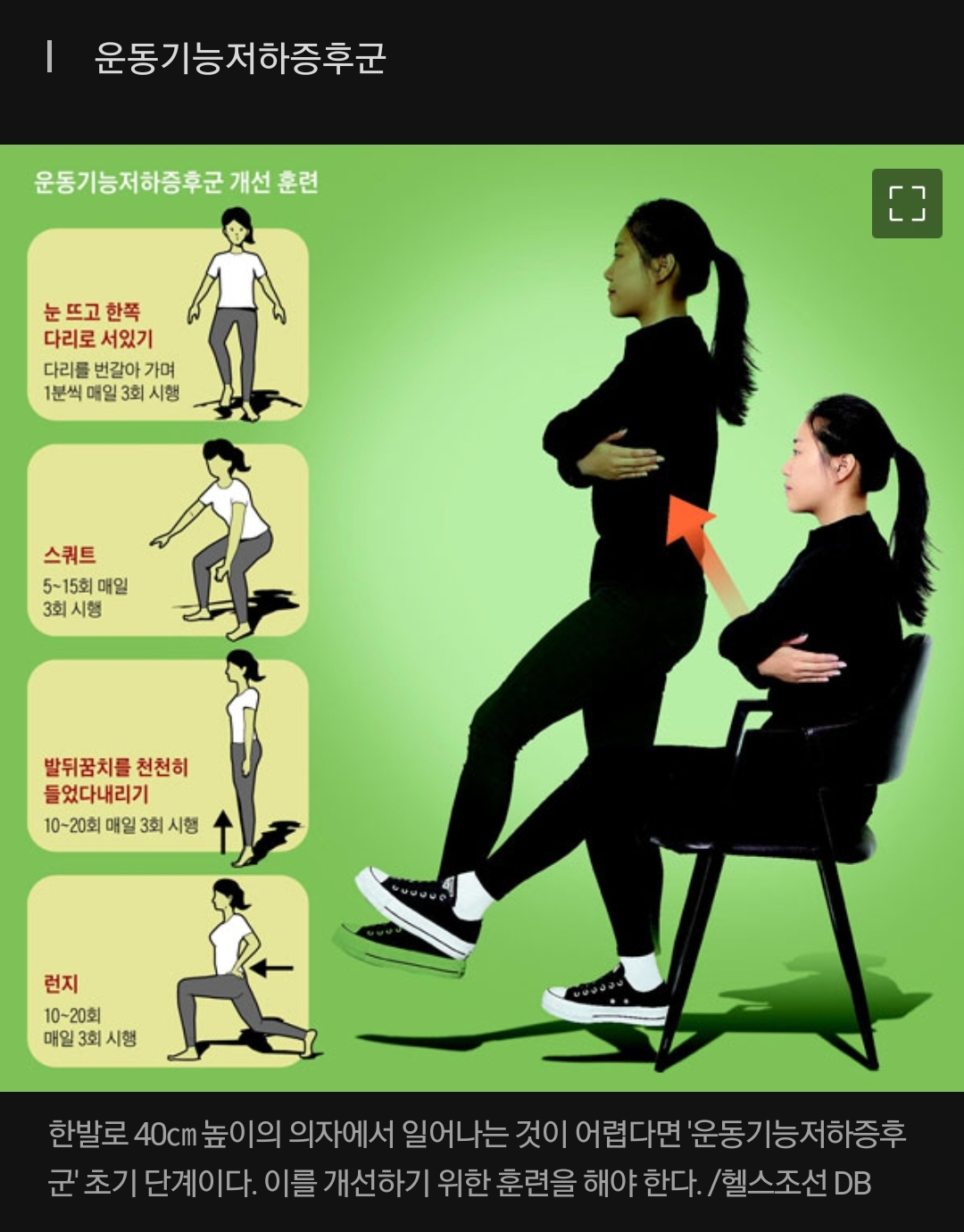 한 발로 40㎝ 높이의 의자에서 일어나는 것이 어렵다면 '운동기능저하증후군' 초기 단계이다. 운동기능저하증후군이란 뼈·척추·관절·신경·근육 같은 운동과 관련된 기관이 약해져 통증이 생