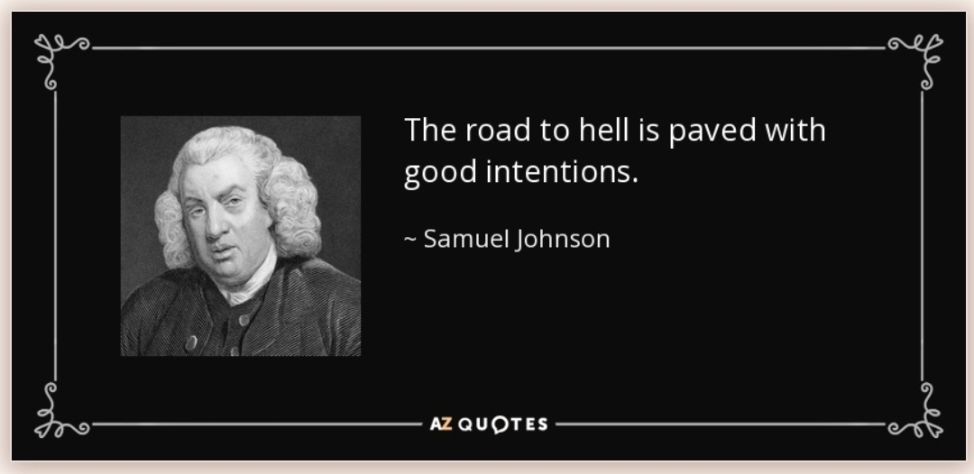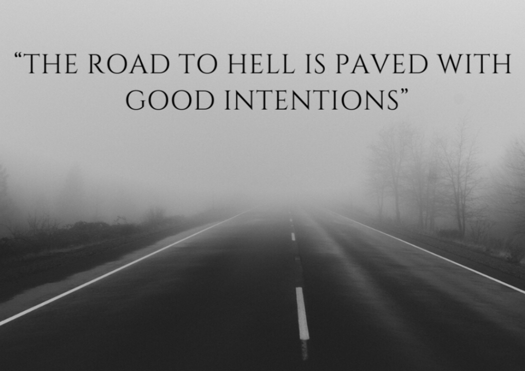 "지옥으로 가는 길은 선의로 포장되어 있다" (The road to hell is paved with good intentions) : 이는 매우 유명한 서양 속담으로, 아무리 의도가 좋더라도 그 결과나 실행 과정이 나쁘면 파멸적인 결과를 낳을 수 있음을 경고합니다.