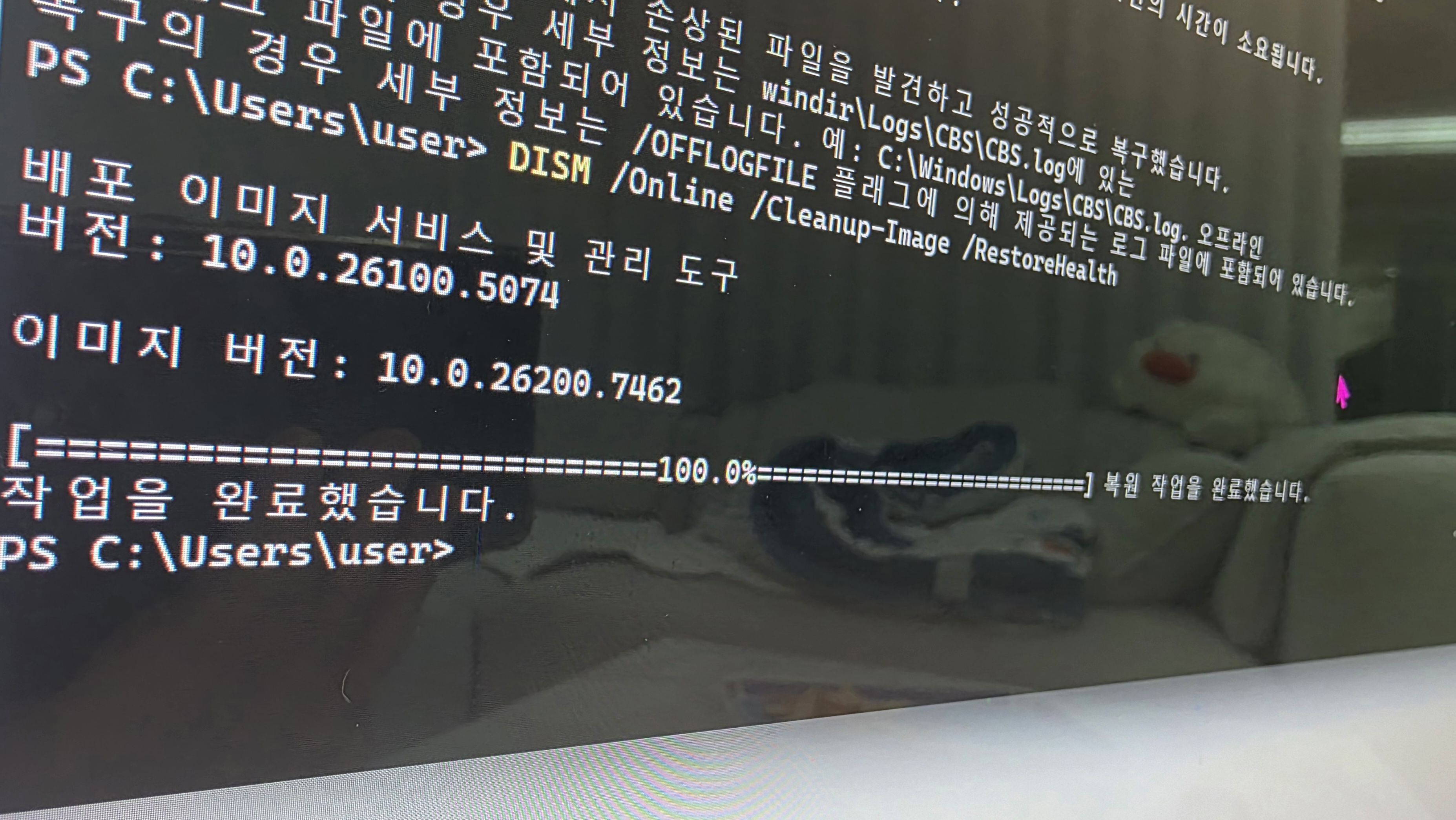 DISM /Online /Cleanup-Image /RestoreHealth 입력 후 엔터 (더 심각한 시스템 이미지 손상 복구).