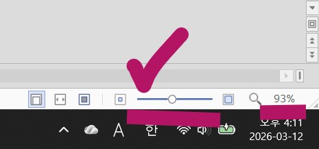 7. 한글파일 화면 우측 하단에서, 돋보기 옆에 있는 버튼(또는 %)을 활용해 한글 파일 전체 사이즈를 줄여서