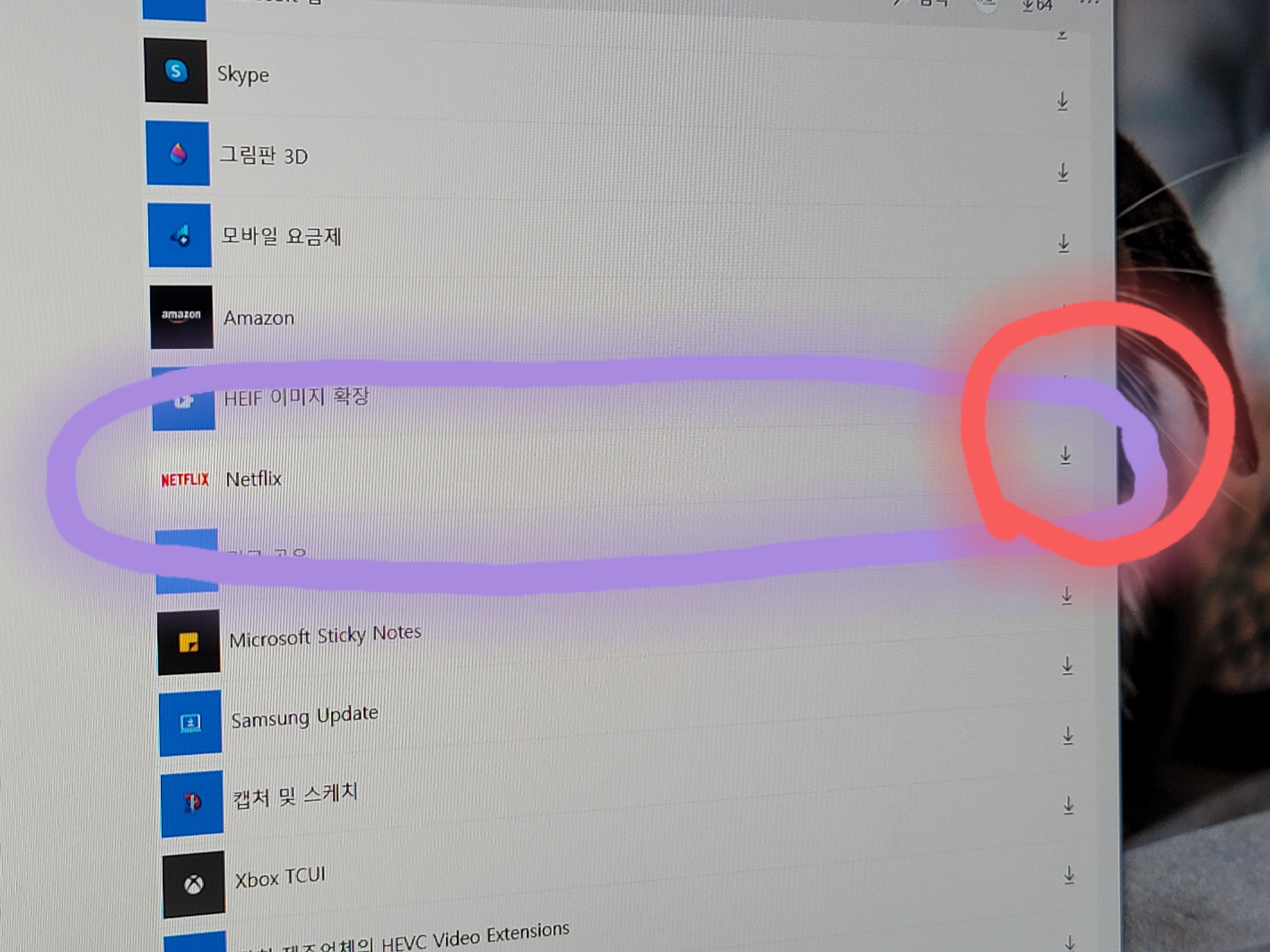 7. 여기서 넷플릭스를 찾은 후, 오른쪽 끝에 있는 《다운로드 화살표》를 눌러 줍니다.