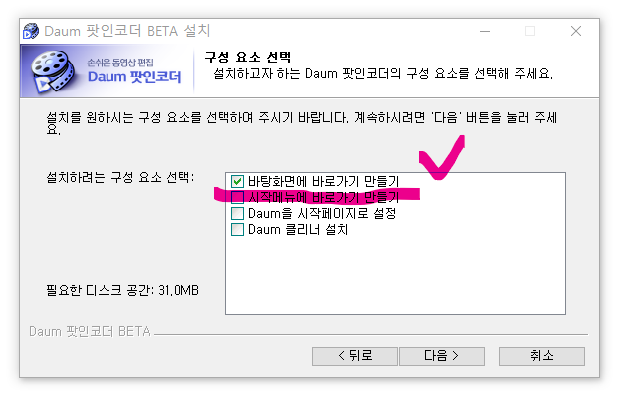 7. 설치하려는 구성요소 선택창이 나오면 원하는 만큼 선택하면 됩니다. 저는 주로 바탕화면에만~~