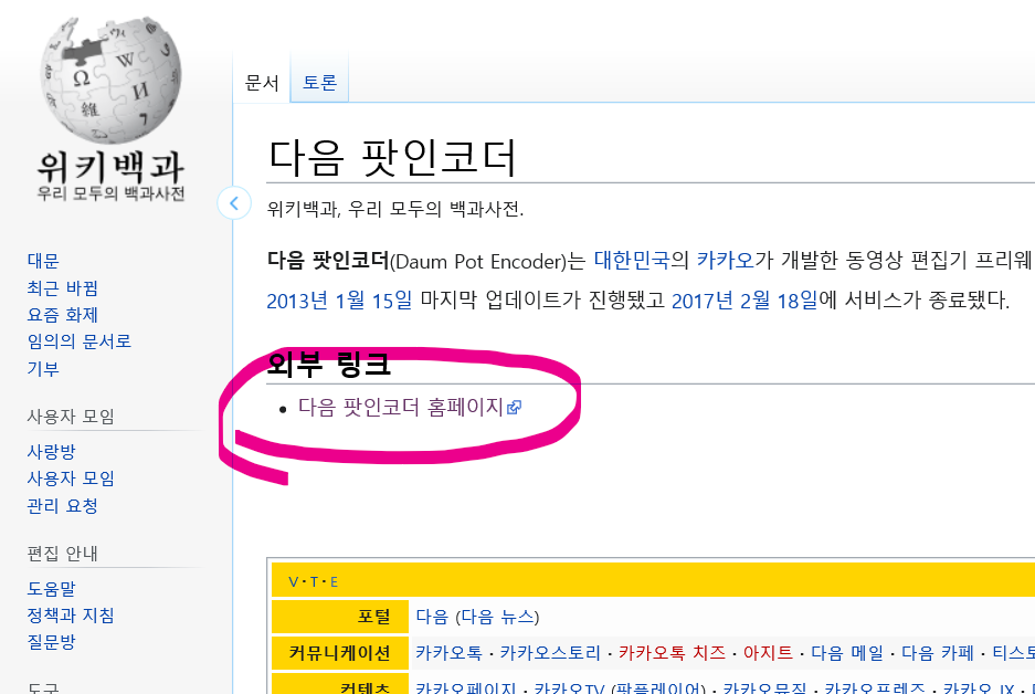 3. 위키백과가 열리며 다음팟 인코더가 나오면 외부링크 <다음팟 인코더 홈페이지>를 클릭해 줍니다.