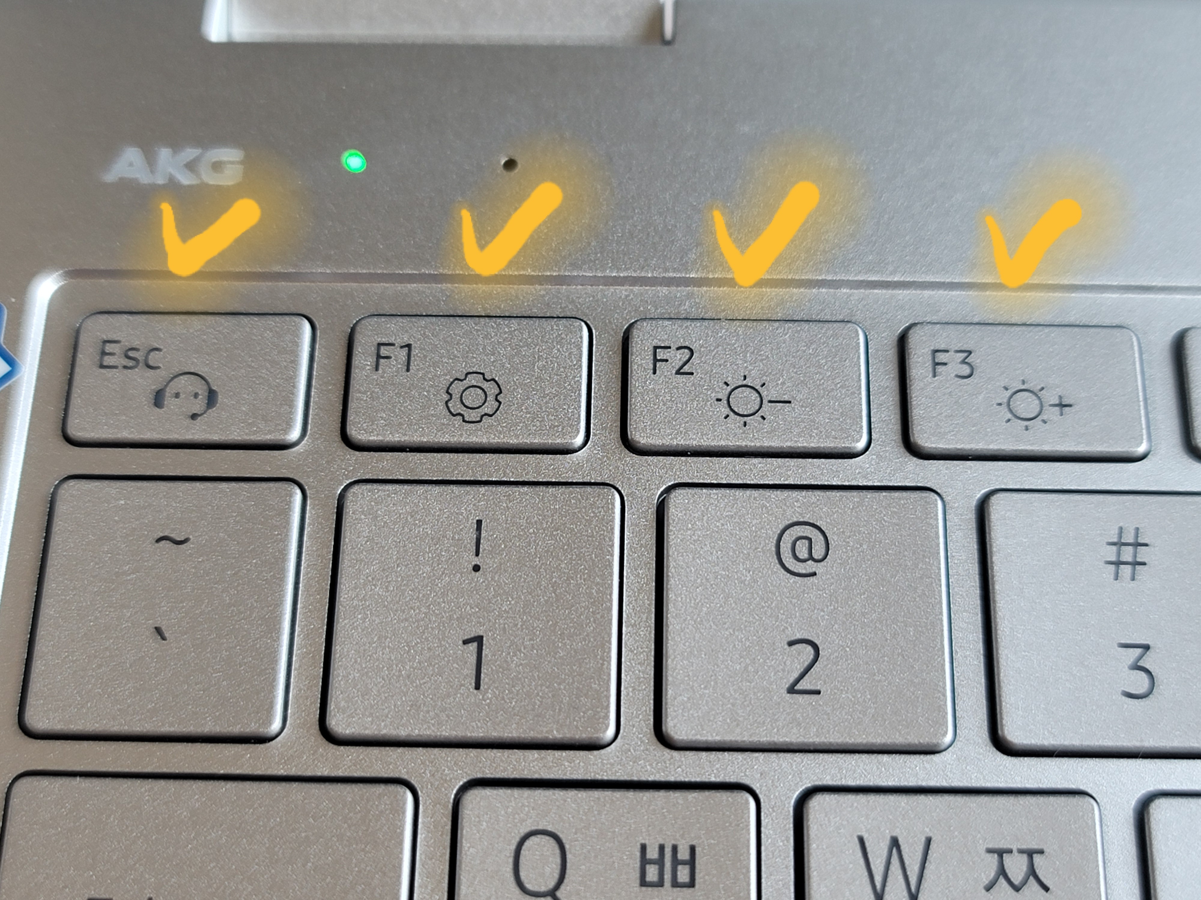 1. 갤럭시북 플렉스의 경우 키보드 위쪽으로 펑션키들이 쭈욱~ 늘어서 있습니다.