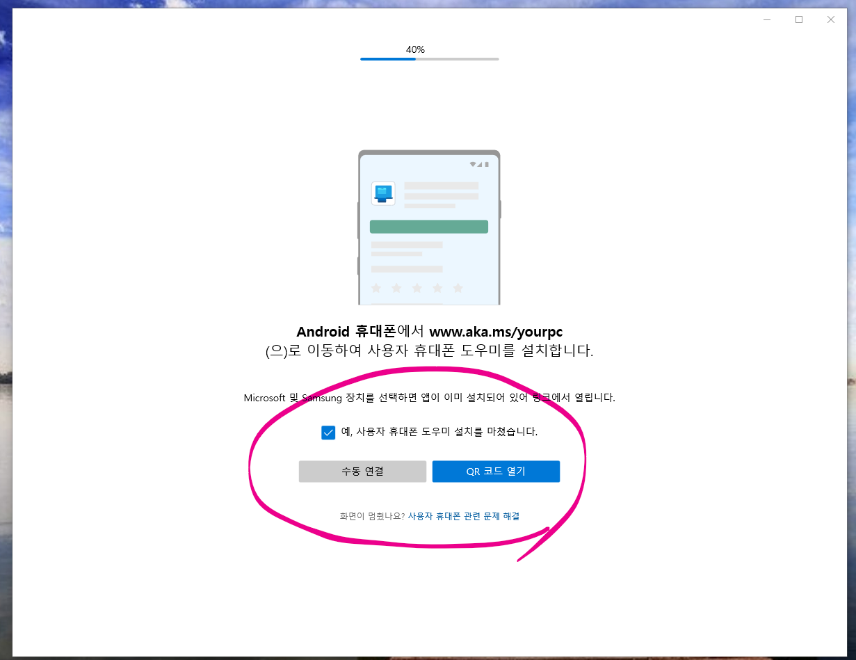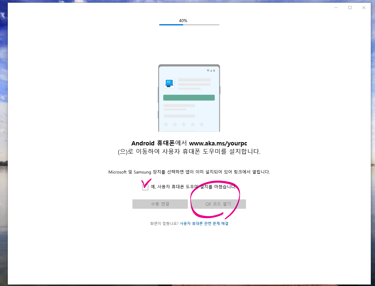 8. 활성화 버튼을 누르면 알아서 다음 화면이 나타나게 되는데, 여기서 《휴대폰과 PC연결》을 눌러 줍니다.
