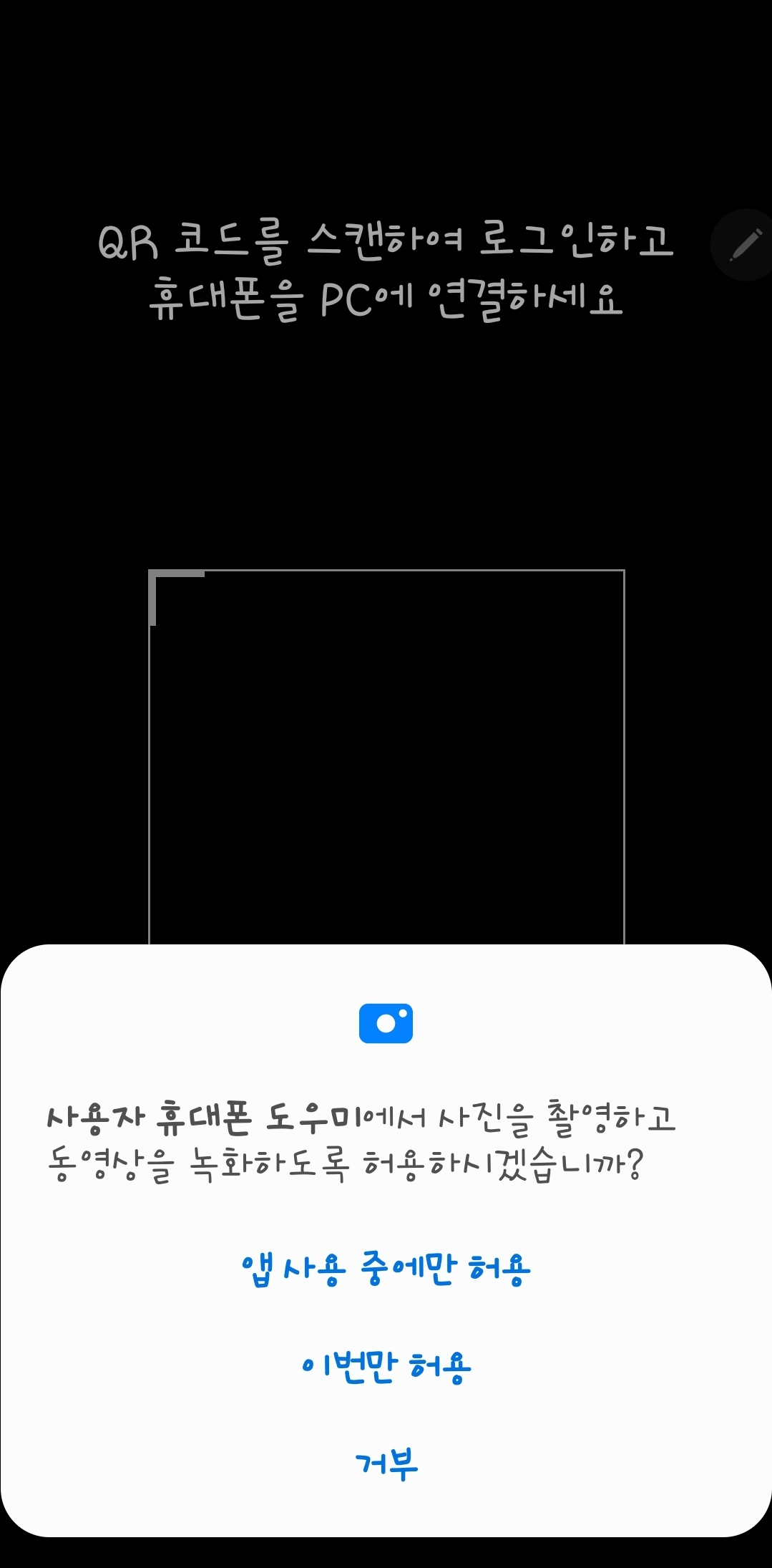 10. 갤럭시노트20 울트라 스마트폰으로 갤럭시북 플렉스에 있는 QR코드를 찍어 줍니다. 그러면 스마트폰에서 권한 허용을 여러번 물어오니 《모두 허용》을 해줘야 되겠죠. 그래야 갤럭시북 플렉스에서 스마트폰의 내용들을 동일하게 볼 수 있게 되니까요👌