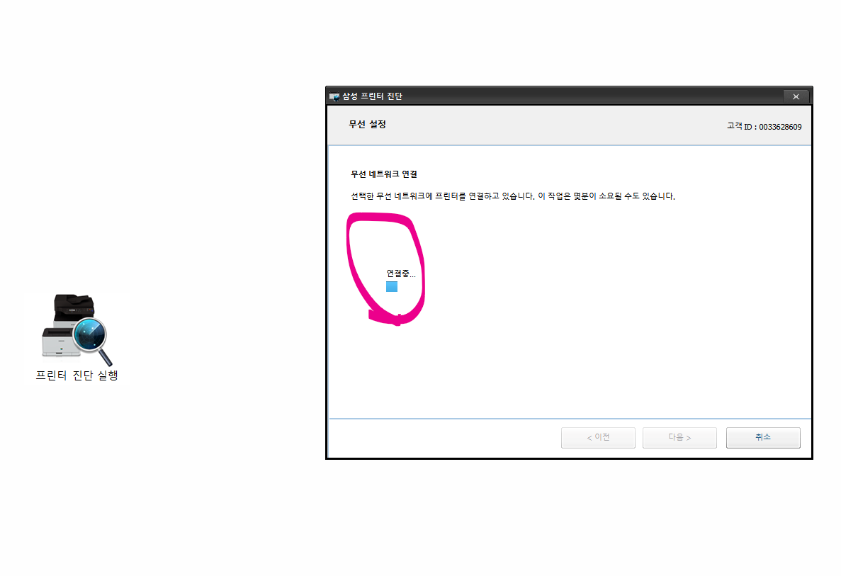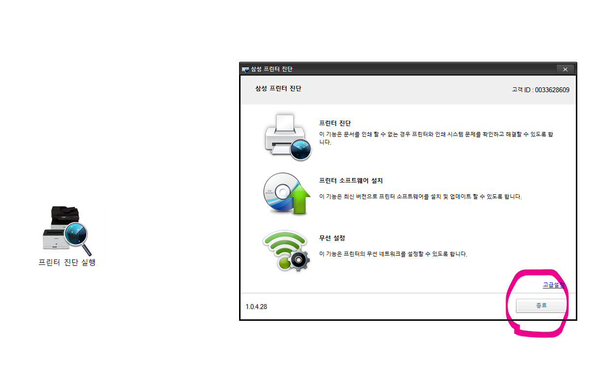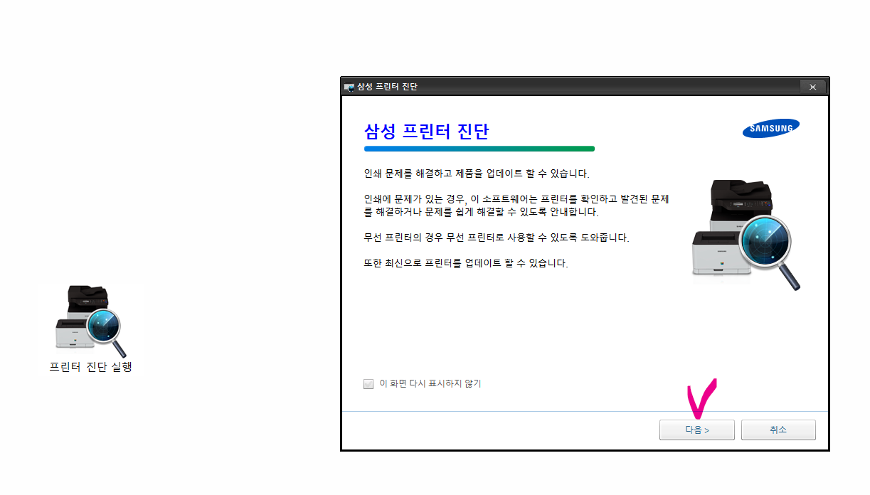 3. 아이콘을 클릭하면 오른쪽으로 《삼성 프린터 진단》이 나타나니 진행합니다.