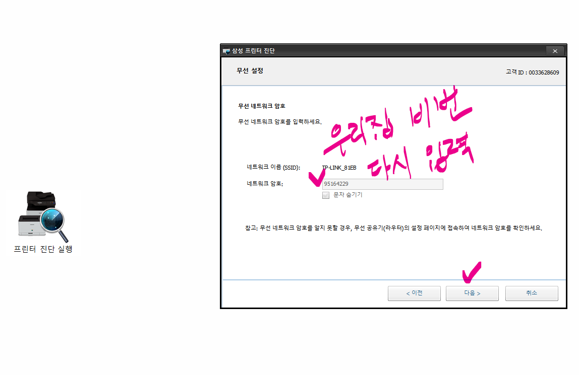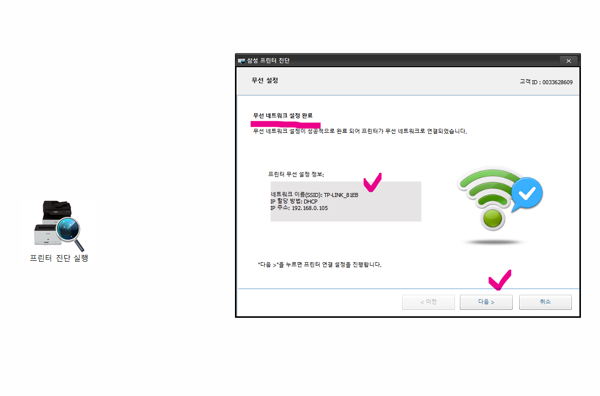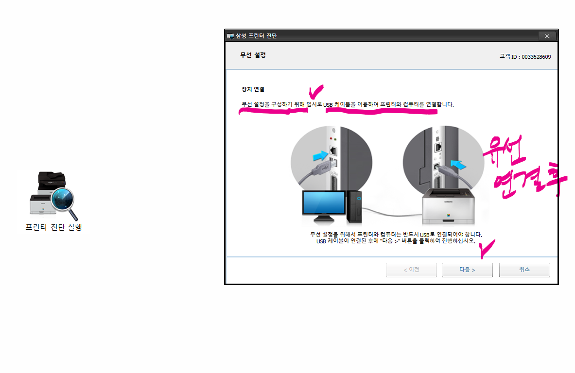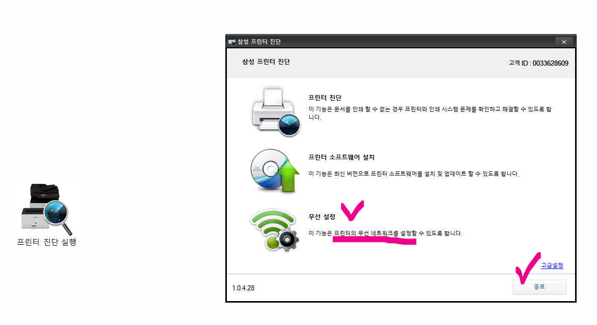 3. 아이콘을 클릭하면 오른쪽으로 《삼성 프린터 진단》이 나타나니 진행합니다.