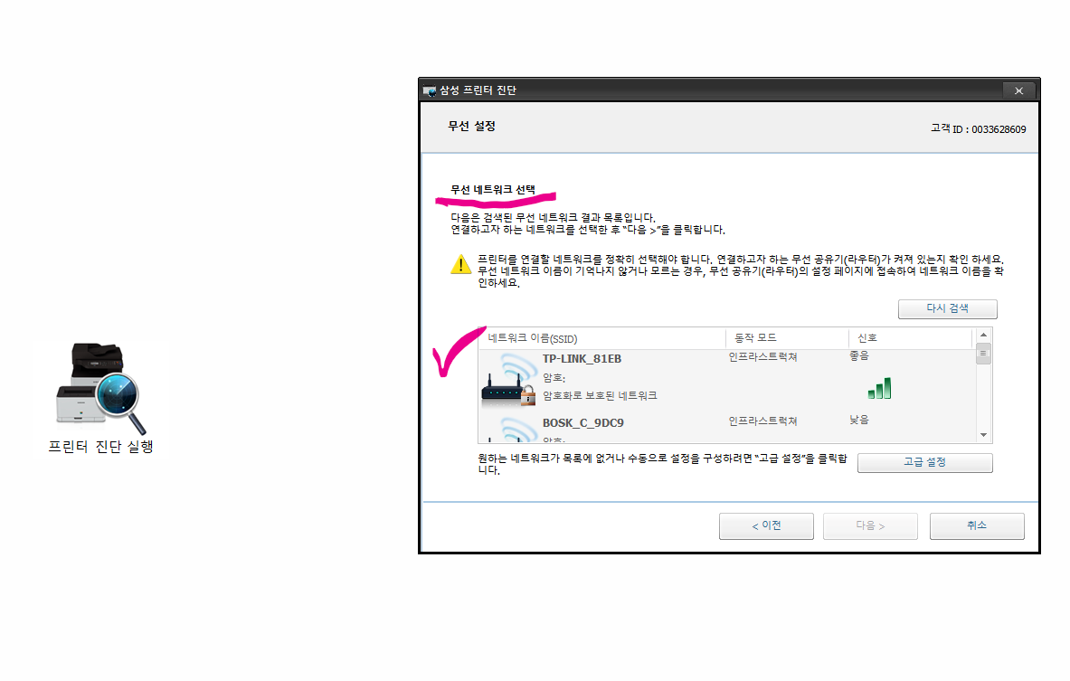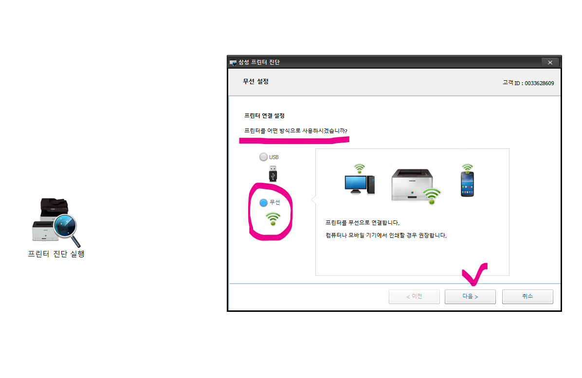 이 방법은 삼성 프린터 진단(SPD) 프로그램 이라고 합니다. Samsung Printer Diagnostics의 약자로 사용자 스스로 문제를 해결하도록 돕는 기능입니다. 여기에는 프린터 진단, 프린트 소프트웨어 설치, 무선 설정이 해당됩니다.