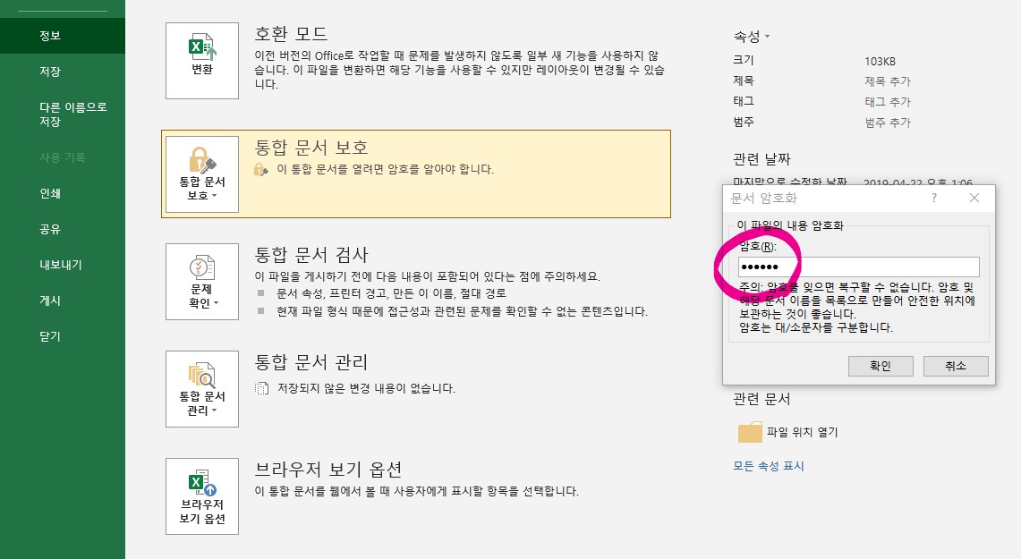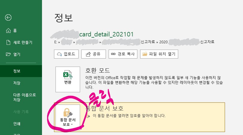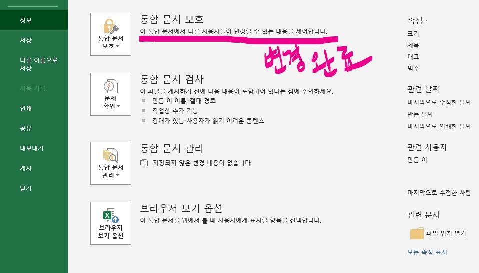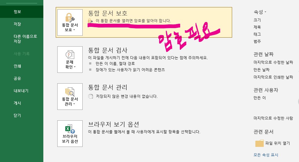 3. 나오는 화면에서 《통합문서보호》를 선택합니다.